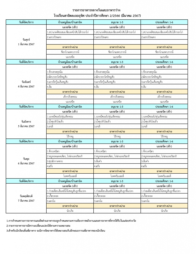 รายการอาหารกลางวันและอาหารว่าง ทุกระดับชั้น ประจำเดือนมีนาคม 2567 (กรุงเทพมหานคร)
