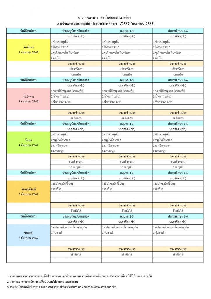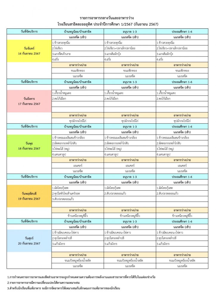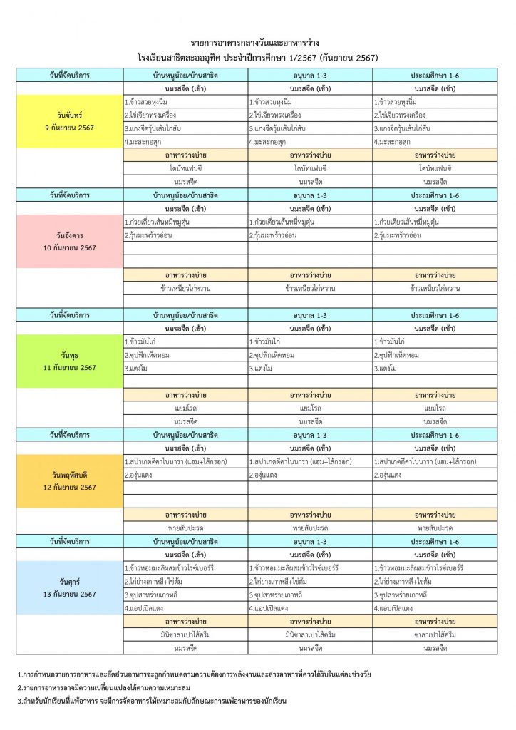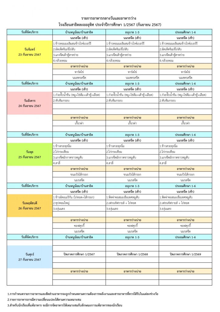 รายการอาหารกลางวันและอาหารว่าง ทุกระดับชั้น ประจำเดือนกันยายน 2567 (กรุงเทพมหานคร)