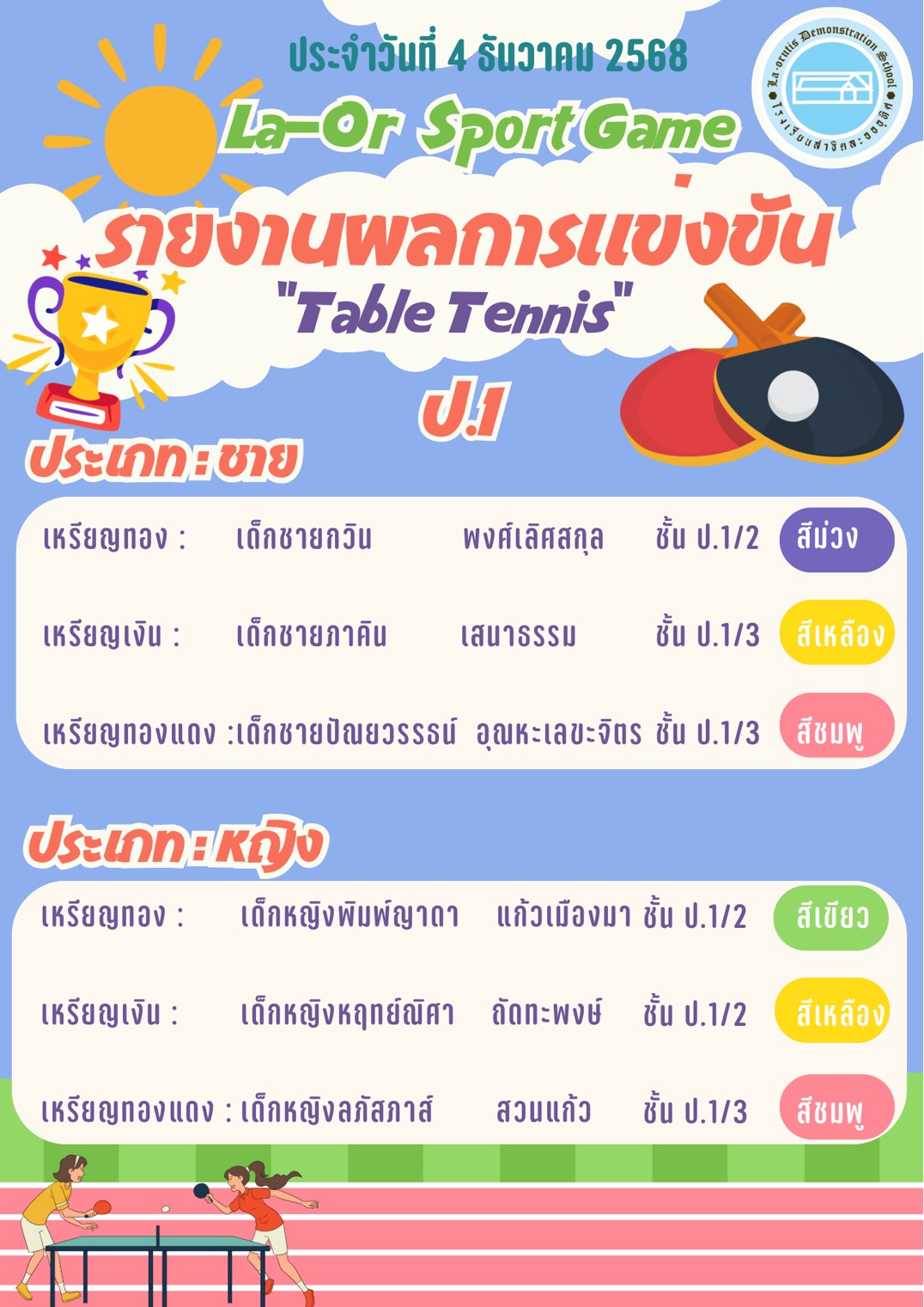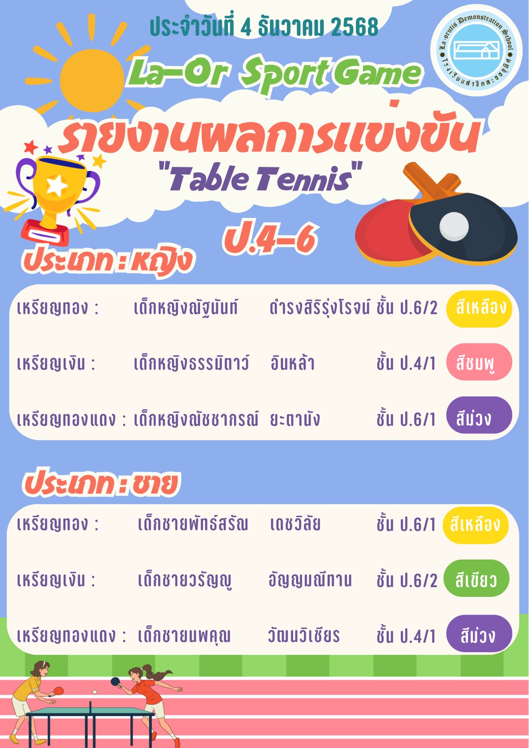 โรงเรียนสาธิตละอออุทิศ ลำปาง ขอรายงานผลการแข่งขันกีฬา เมื่อวันที่ 4 ธันวาคม 2568 ดังนี้