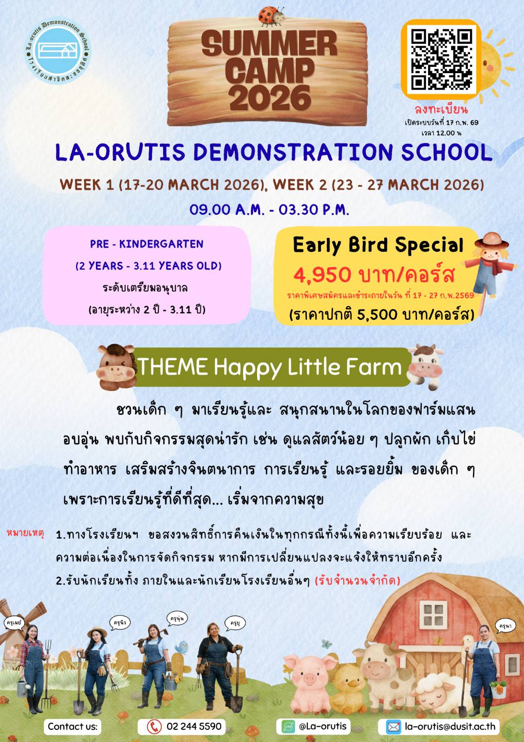 Happy Little Farm (For Pre-Kindergarten (Ages: 2 Years – 3 Years 11 Months)) เรียนวันที่ 17 – 27 มีนาคม 2569 รวม 9 วัน ราคา Early Bird 4,950 บาท (ราคาปกติ 5,500 บาท)