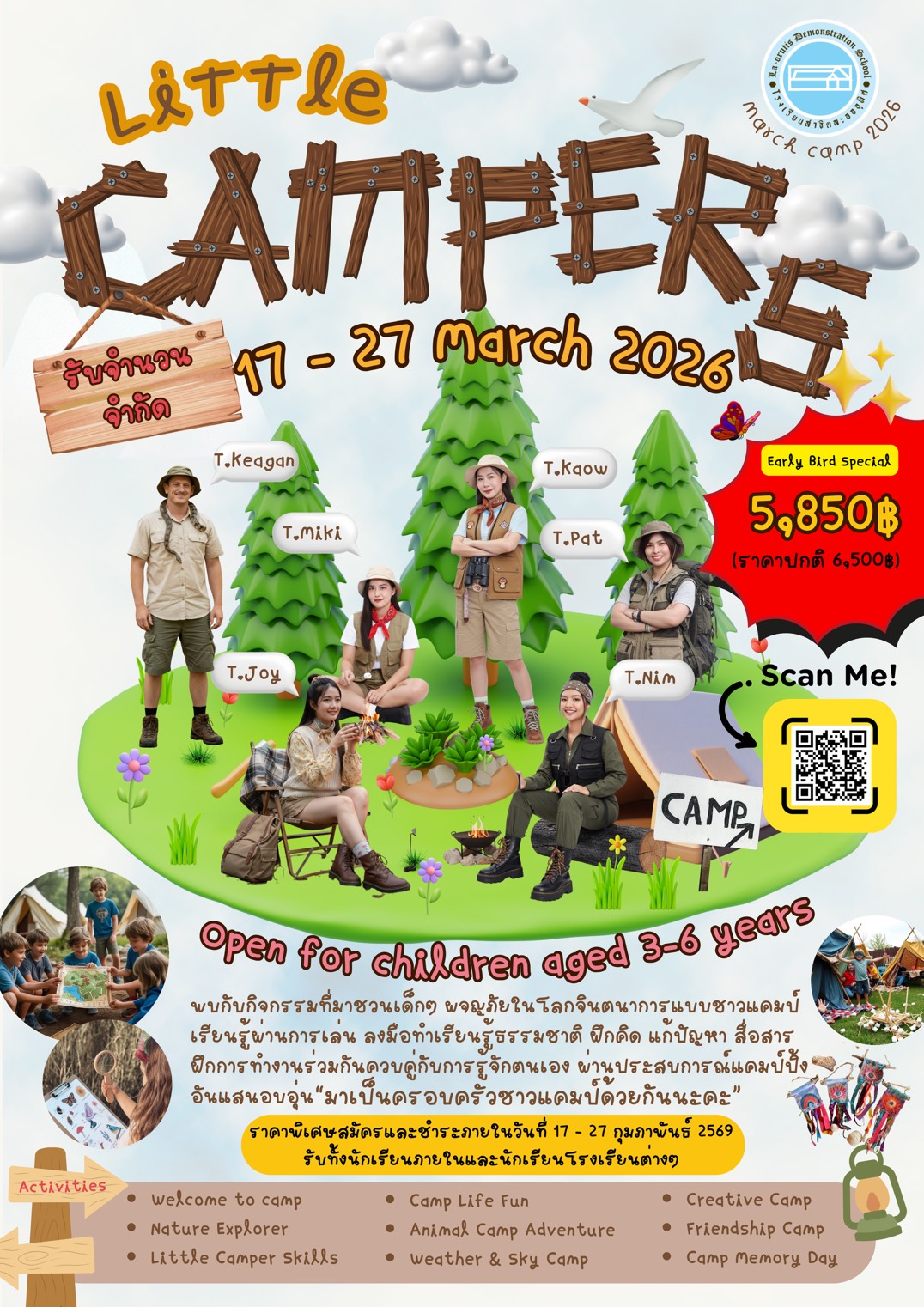 Little Campers (For Kindergarten (3 – 5 years old)) เรียนวันที่ 17 – 27 มีนาคม 2569 รวม 9 วัน ราคา Early Bird 5,850 บาท (ราคาปกติ 6,500 บาท)