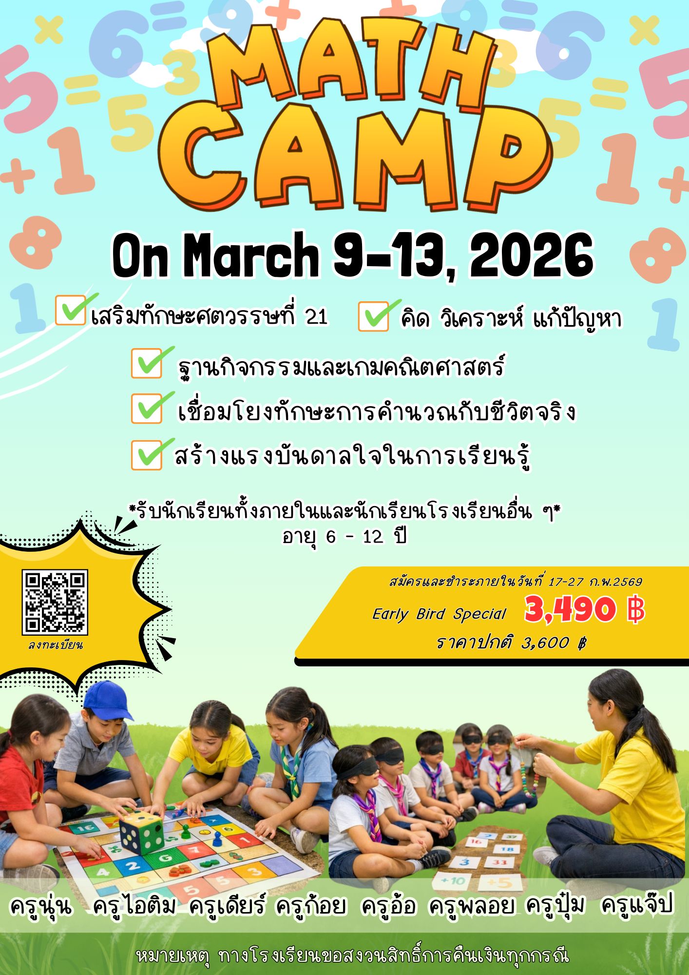 Math Camp (For Primary (6-12 years old)) ระดับประถมศึกษา (อายุระหว่าง 6 – 12 ปี) เรียนวันที่ 9 – 13 มีนาคม 2569 รวม 5 วัน ราคา Early Bird 3,490 บาท (ราคาปกติ 3,600 บาท)
