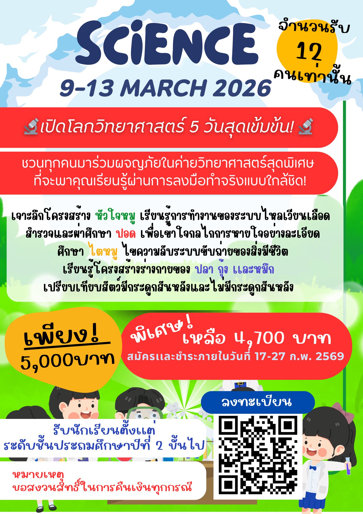 Sciences เปิดโลกวิทยาศาสตร์ (For Primary 2-6) เรียนวันที่ 9 – 13 มีนาคม 2569 จำนวน 5 วัน ราคา Early Bird 4,700 บาท (ราคาปกติ 5,000 บาท)