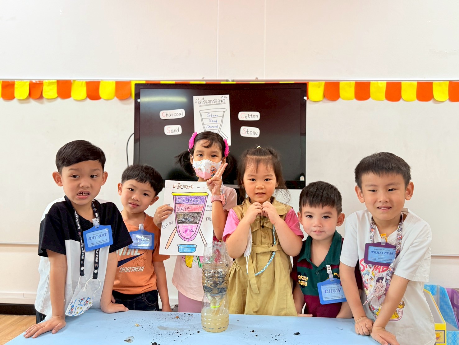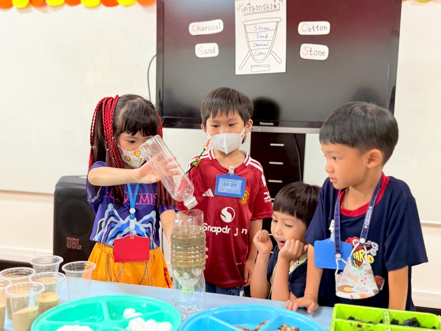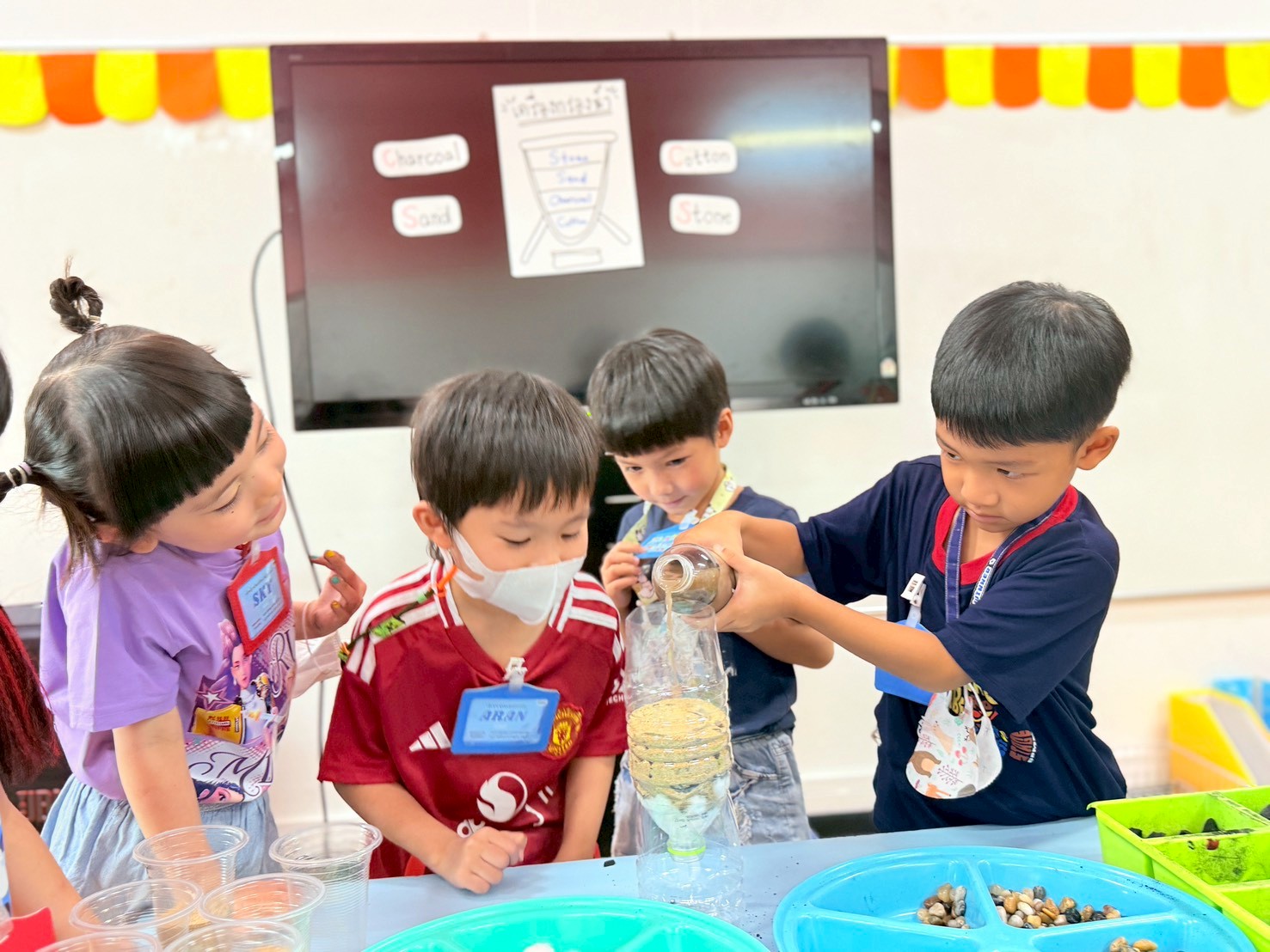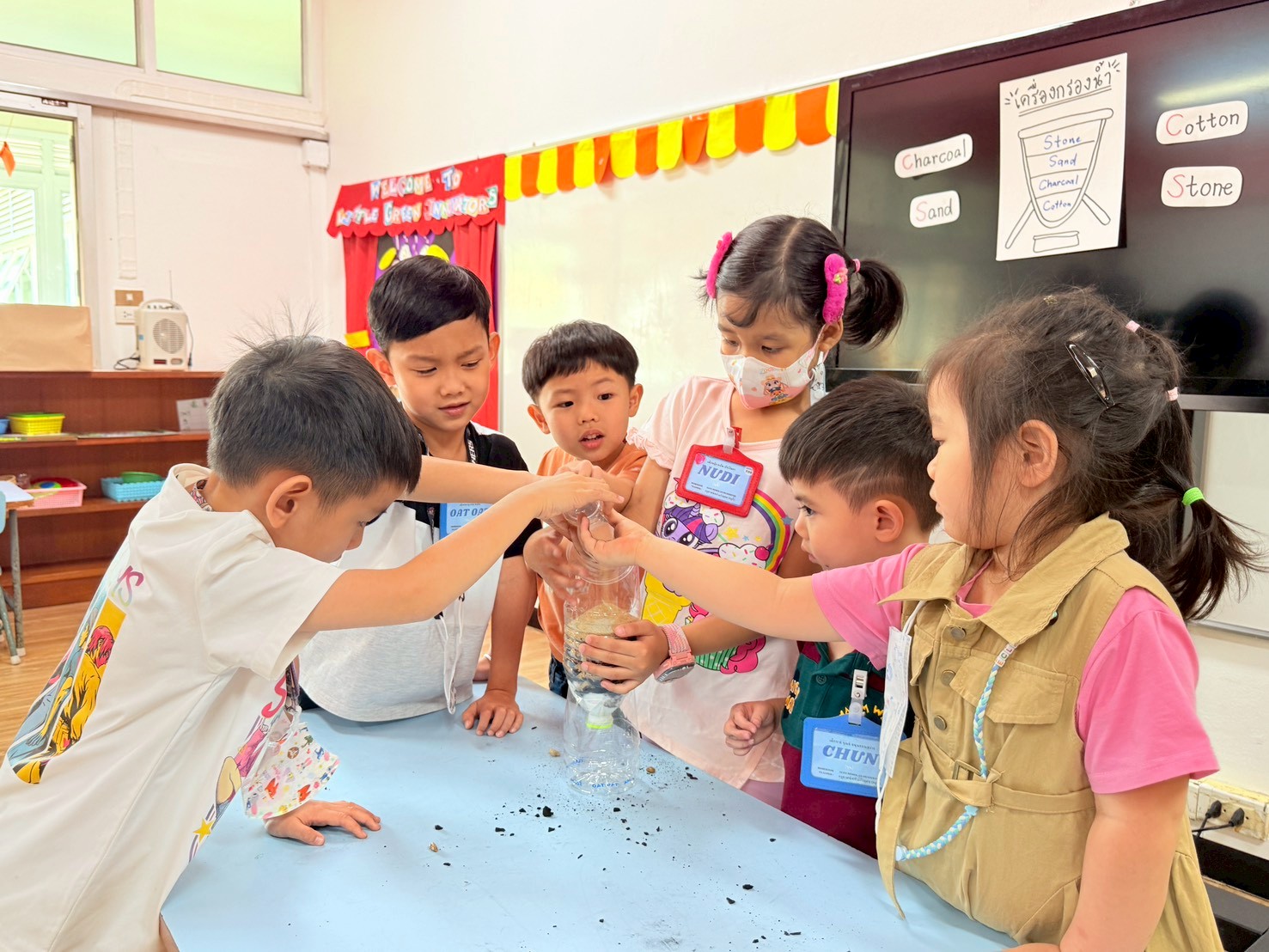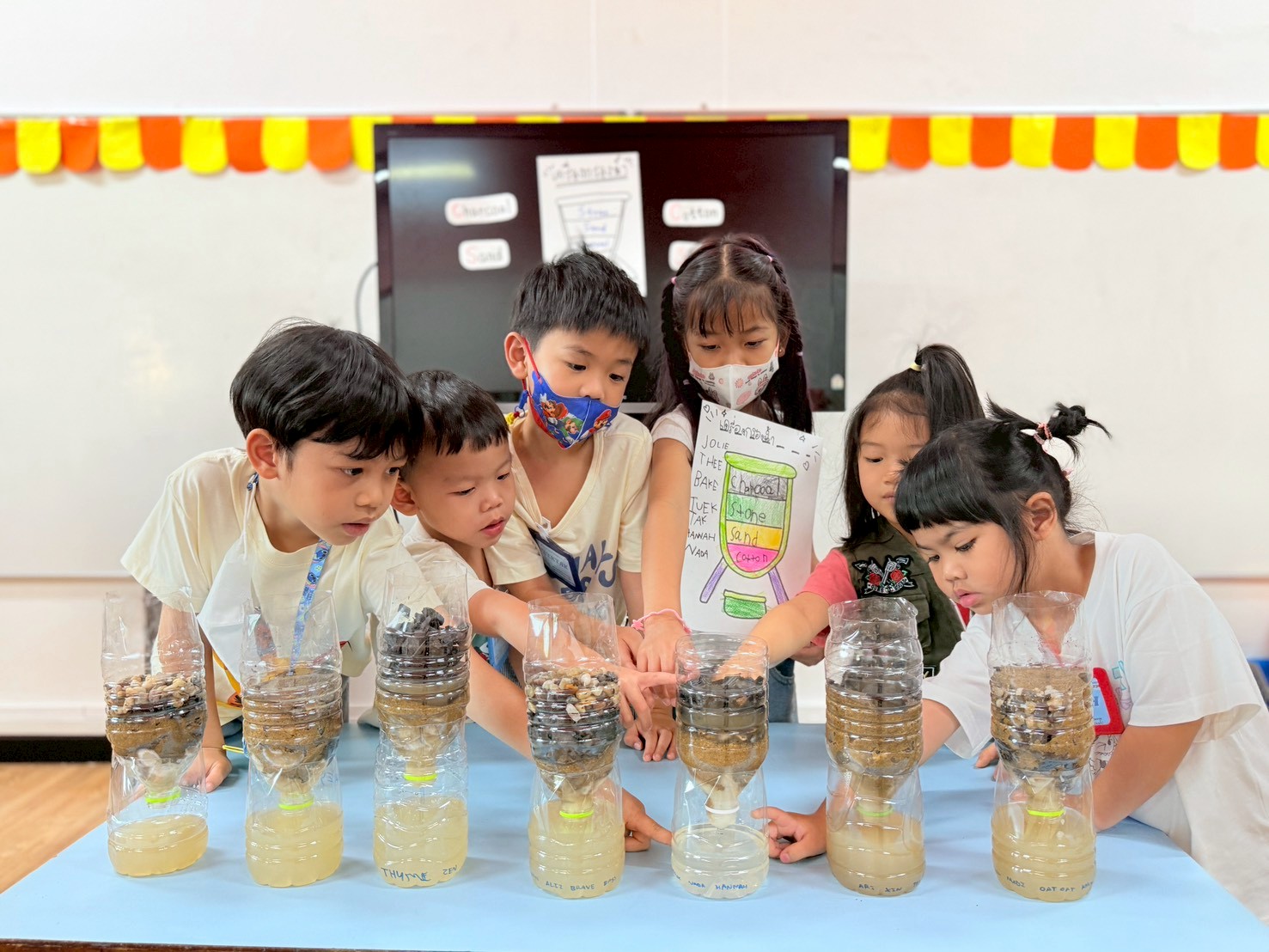 👷♂️จากนั้นเด็กได้ คิดวิธีทำน้ำขุ่นๆให้กลับมาใสด้วยการใช้เครื่องกรองน้ำD.I.Y จากขวดน้ำพลาสติก ไปดูกันว่า เด็กๆจะสามารถเปลี่ยนน้ำเสียให้เป็นน้ำใสได้หรือไม่ เป็นกำลังใจให้เด็กๆด้วยนะคะ💧