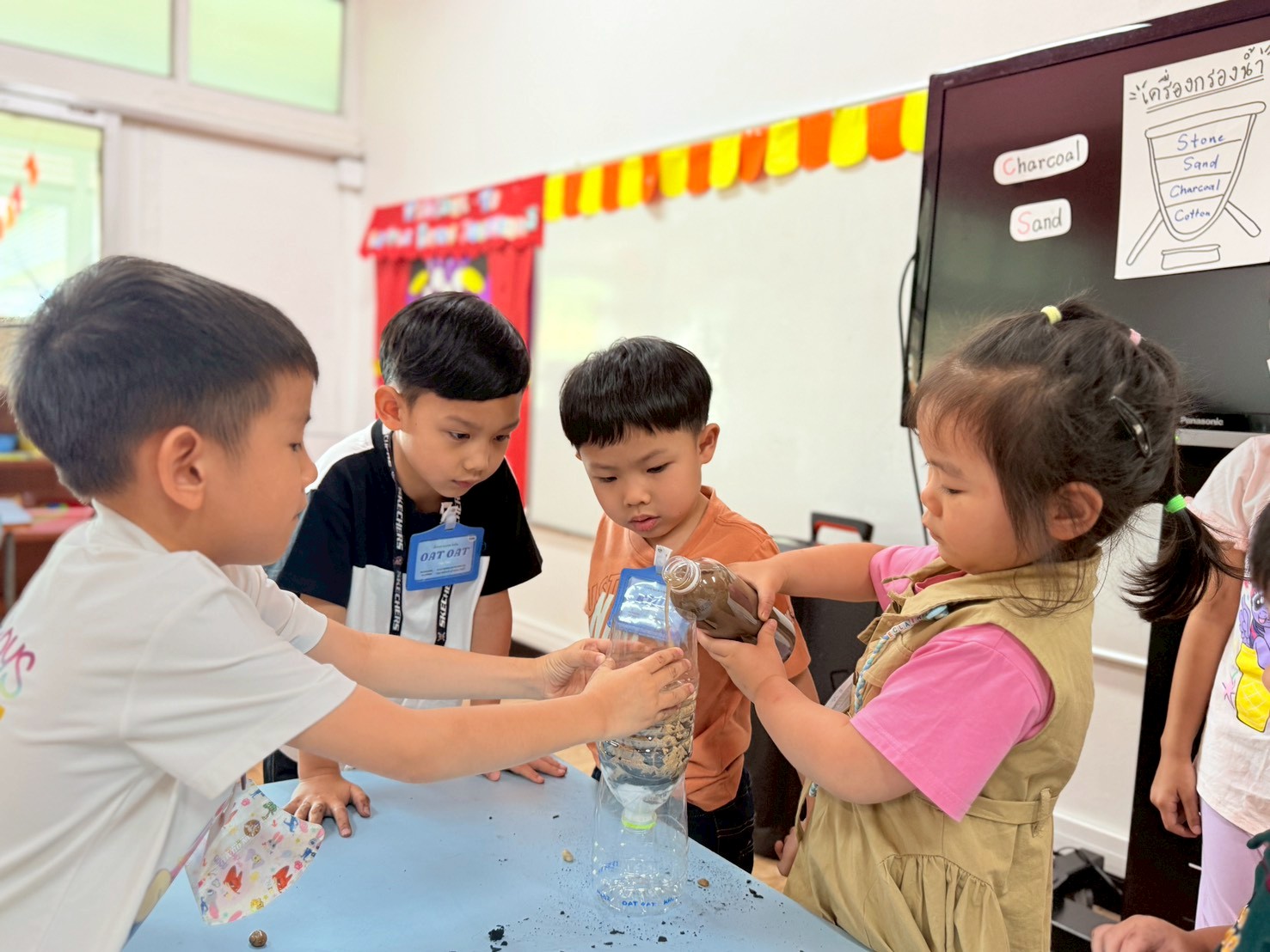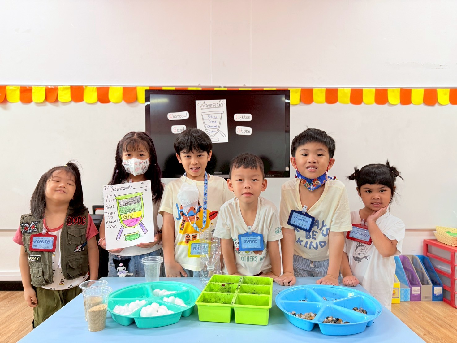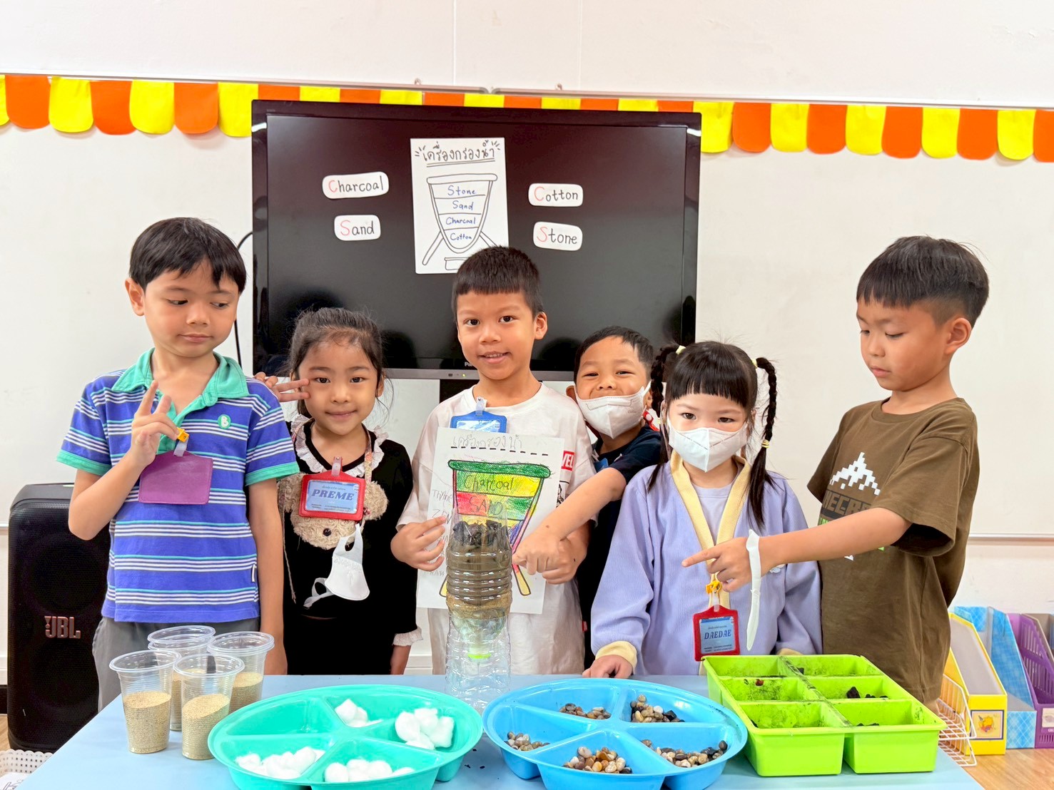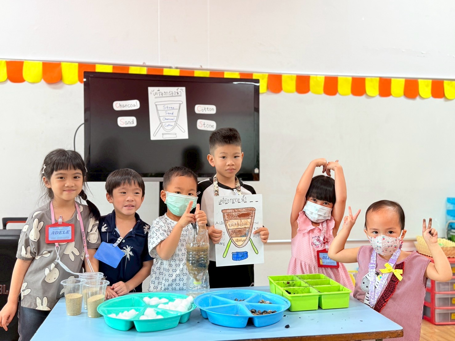 👷♂️จากนั้นเด็กได้ คิดวิธีทำน้ำขุ่นๆให้กลับมาใสด้วยการใช้เครื่องกรองน้ำD.I.Y จากขวดน้ำพลาสติก ไปดูกันว่า เด็กๆจะสามารถเปลี่ยนน้ำเสียให้เป็นน้ำใสได้หรือไม่ เป็นกำลังใจให้เด็กๆด้วยนะคะ💧