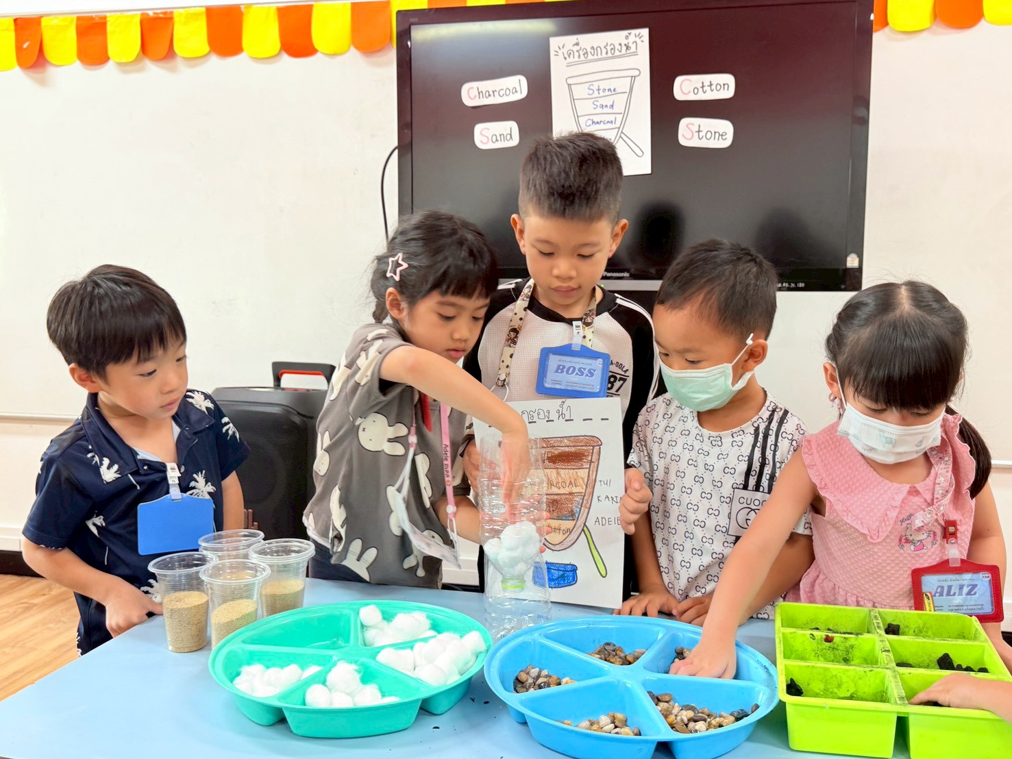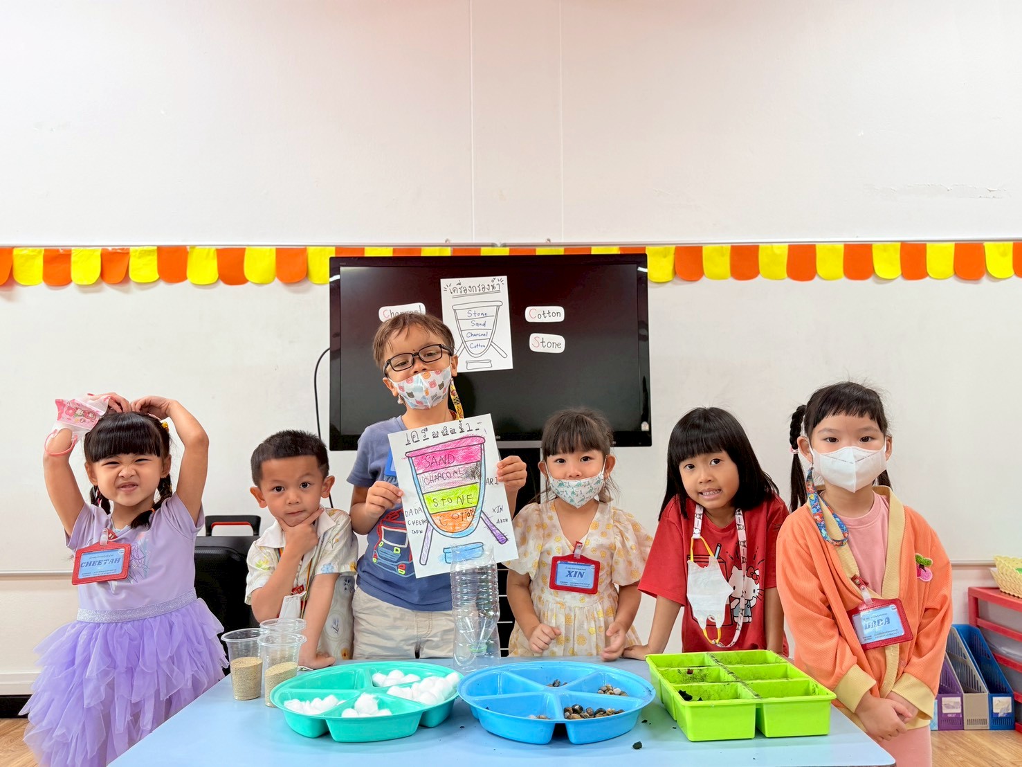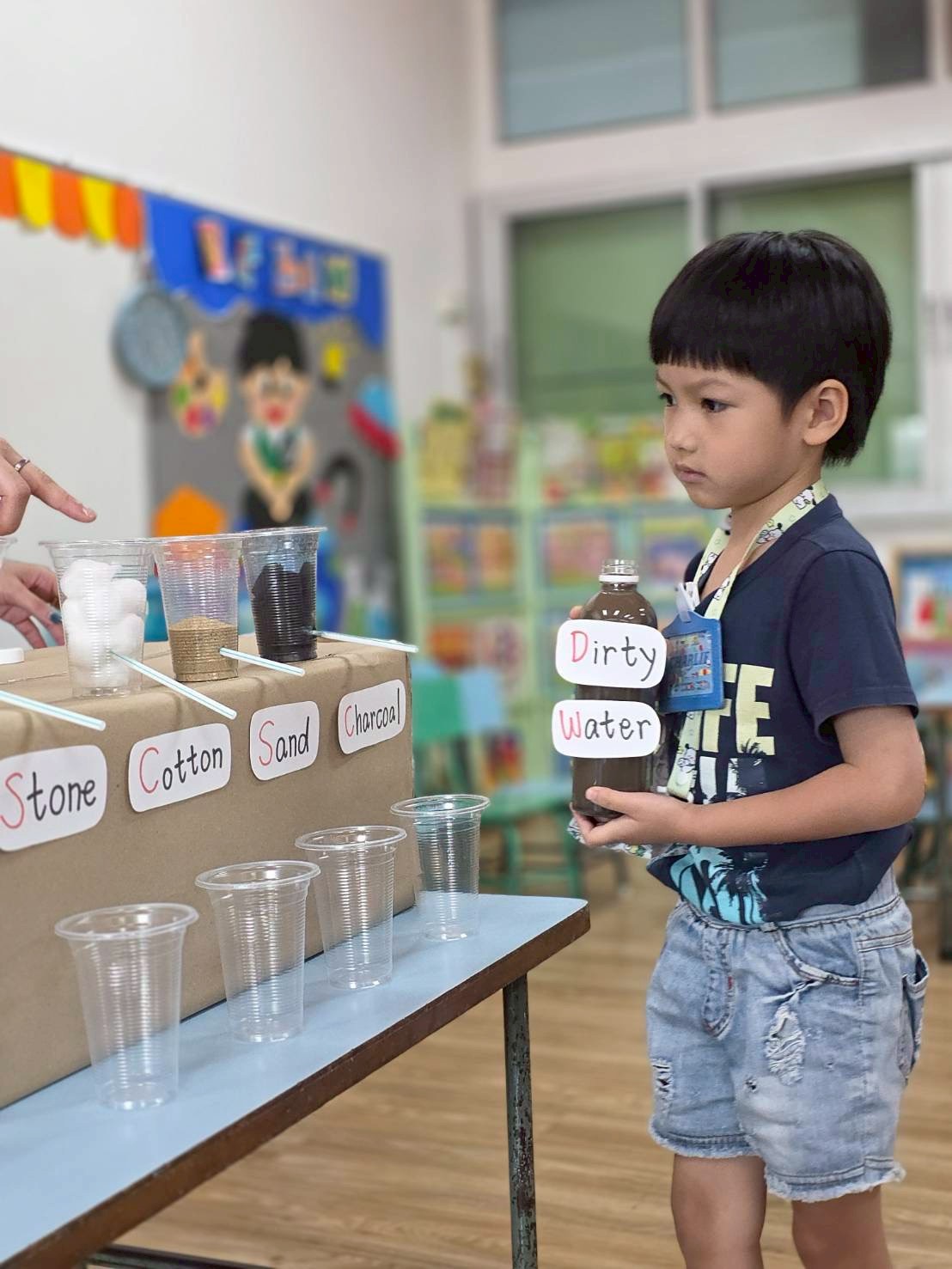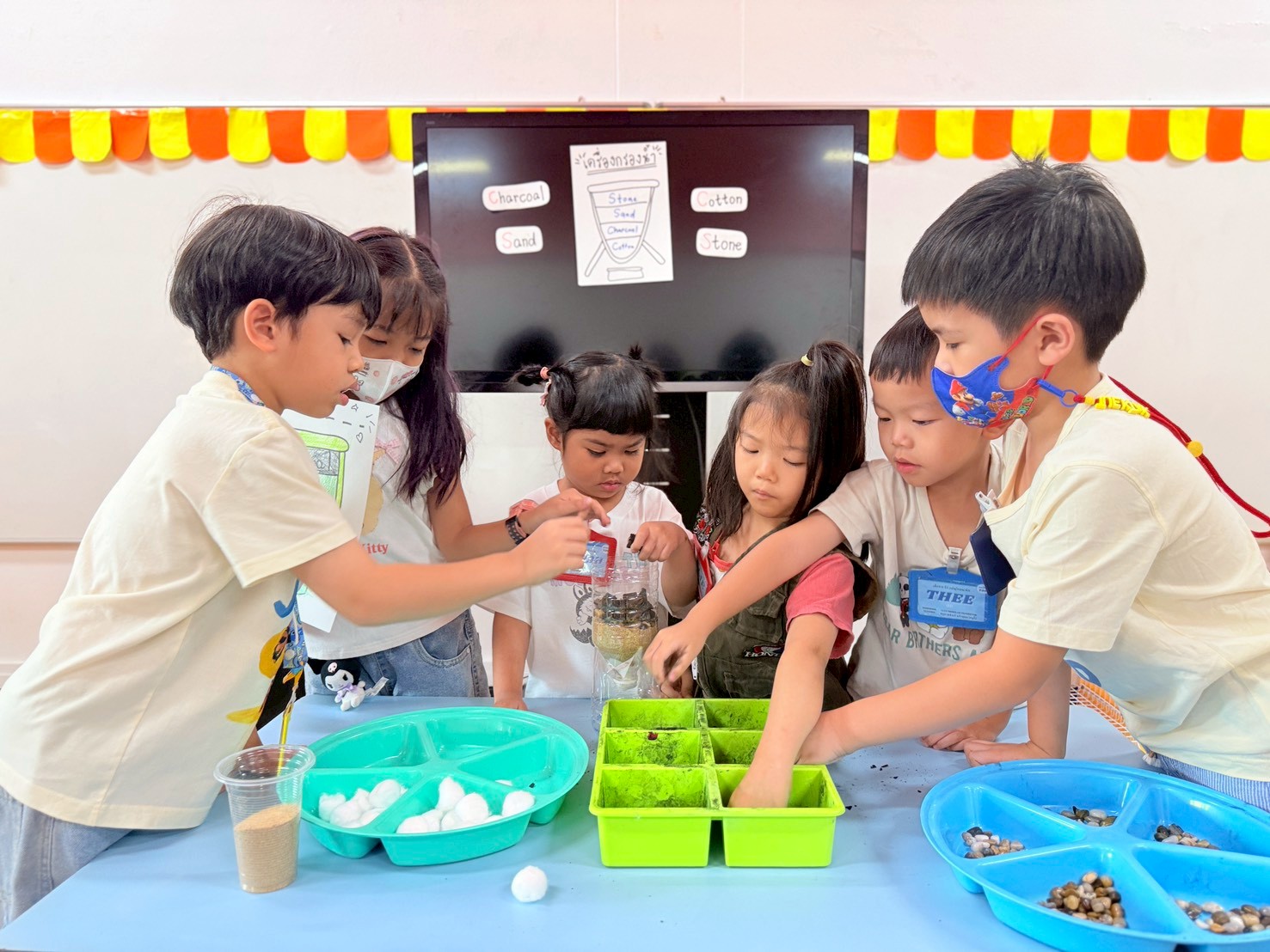 👷♂️จากนั้นเด็กได้ คิดวิธีทำน้ำขุ่นๆให้กลับมาใสด้วยการใช้เครื่องกรองน้ำD.I.Y จากขวดน้ำพลาสติก ไปดูกันว่า เด็กๆจะสามารถเปลี่ยนน้ำเสียให้เป็นน้ำใสได้หรือไม่ เป็นกำลังใจให้เด็กๆด้วยนะคะ💧