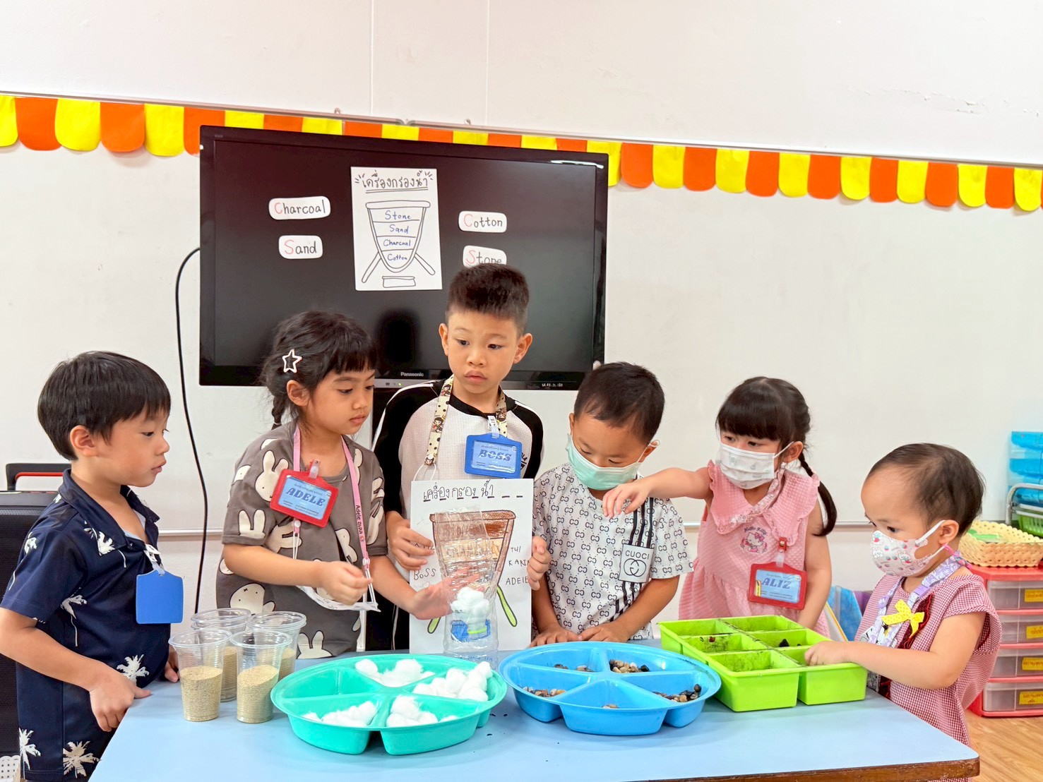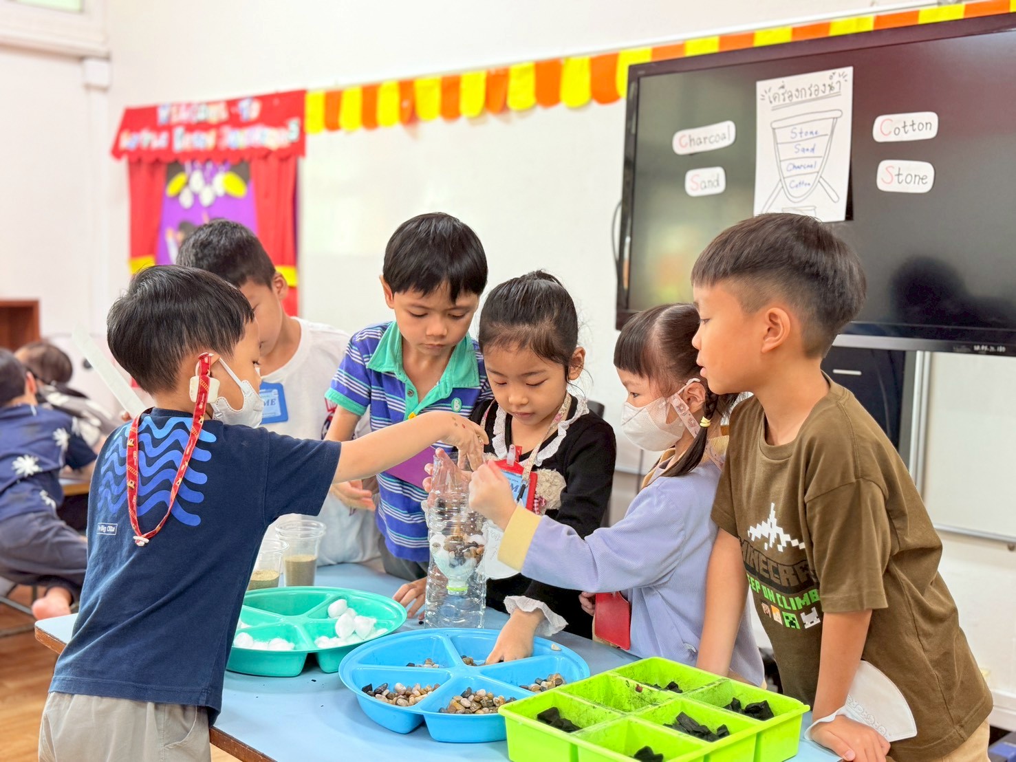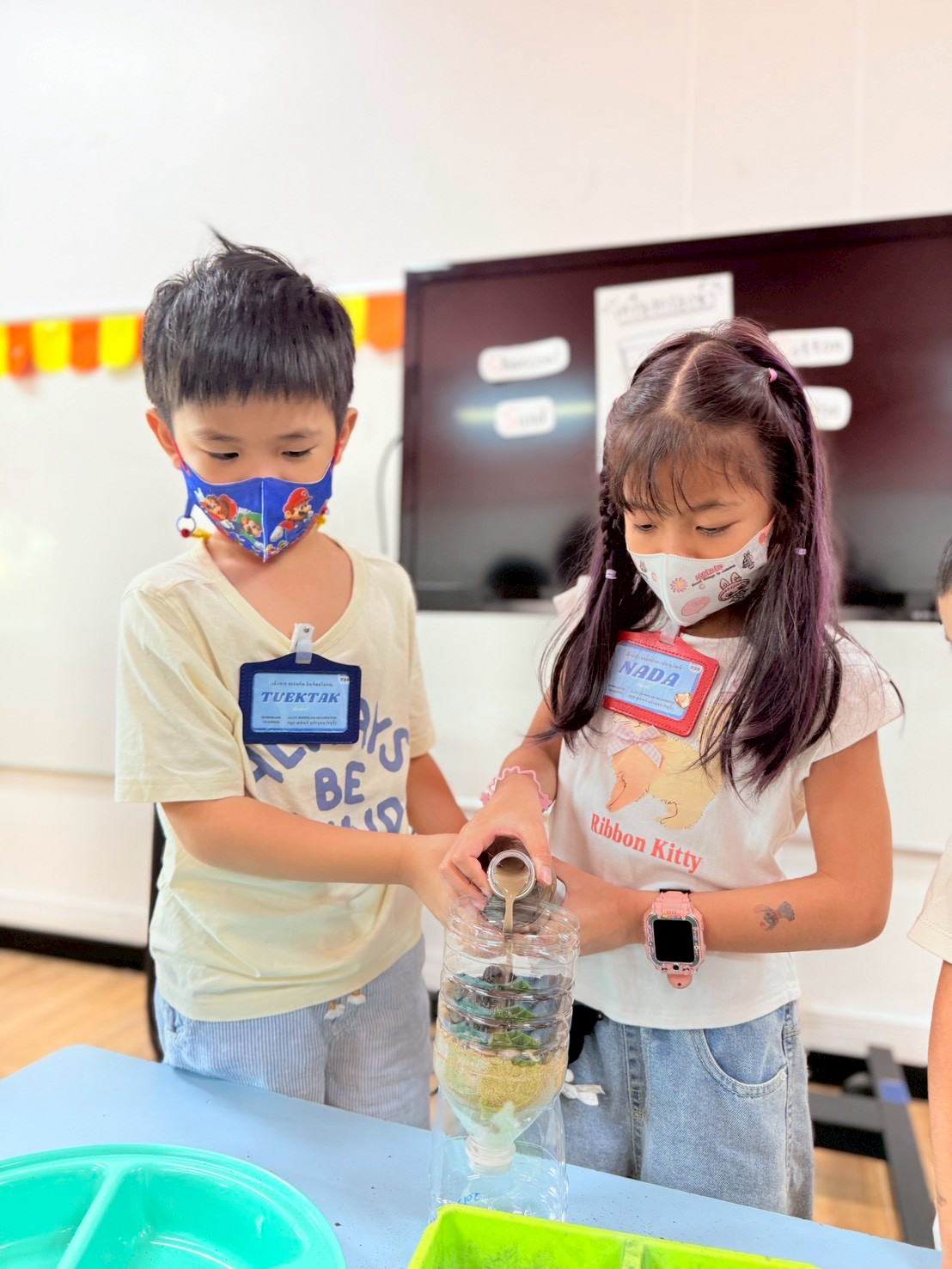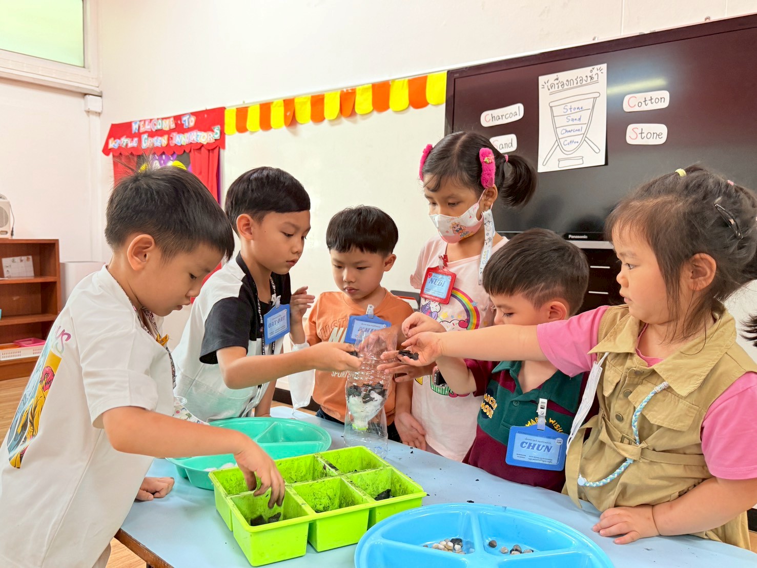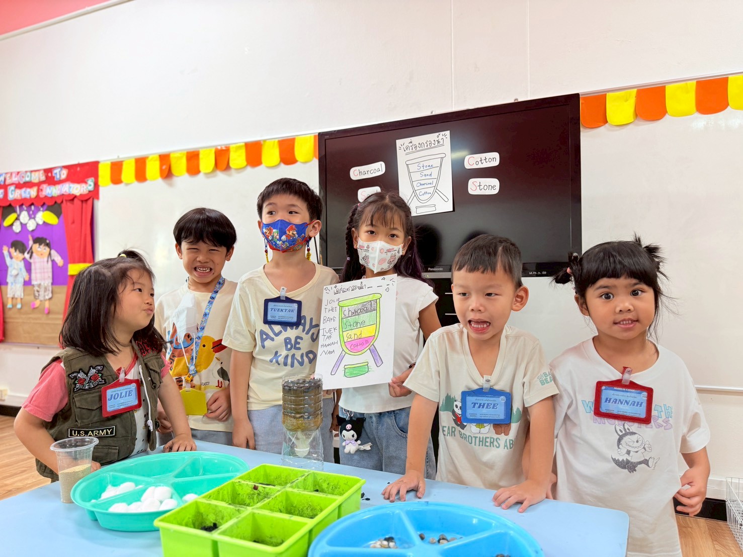 👷♂️จากนั้นเด็กได้ คิดวิธีทำน้ำขุ่นๆให้กลับมาใสด้วยการใช้เครื่องกรองน้ำD.I.Y จากขวดน้ำพลาสติก ไปดูกันว่า เด็กๆจะสามารถเปลี่ยนน้ำเสียให้เป็นน้ำใสได้หรือไม่ เป็นกำลังใจให้เด็กๆด้วยนะคะ💧