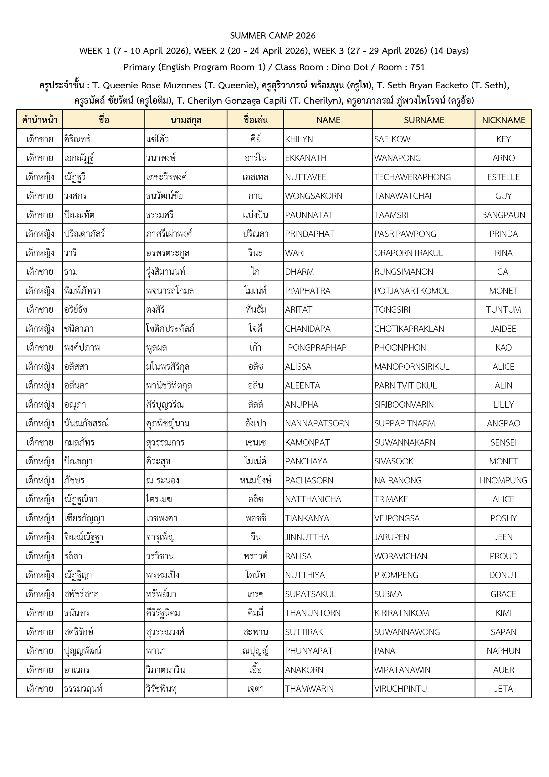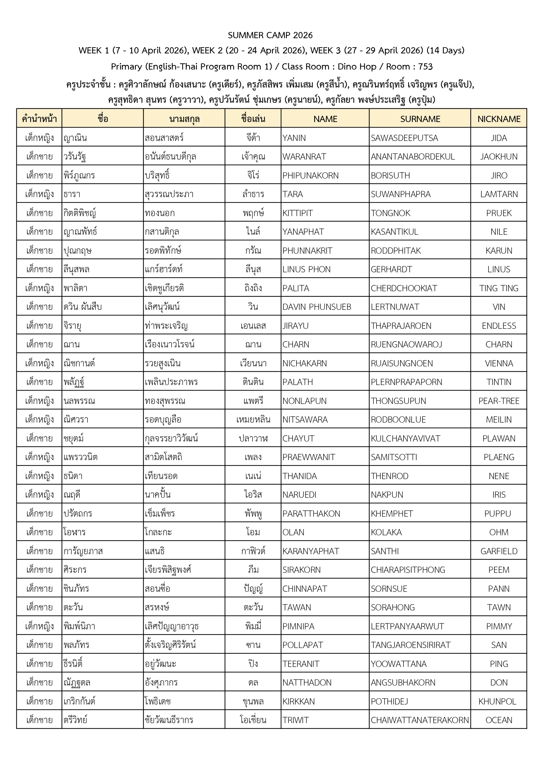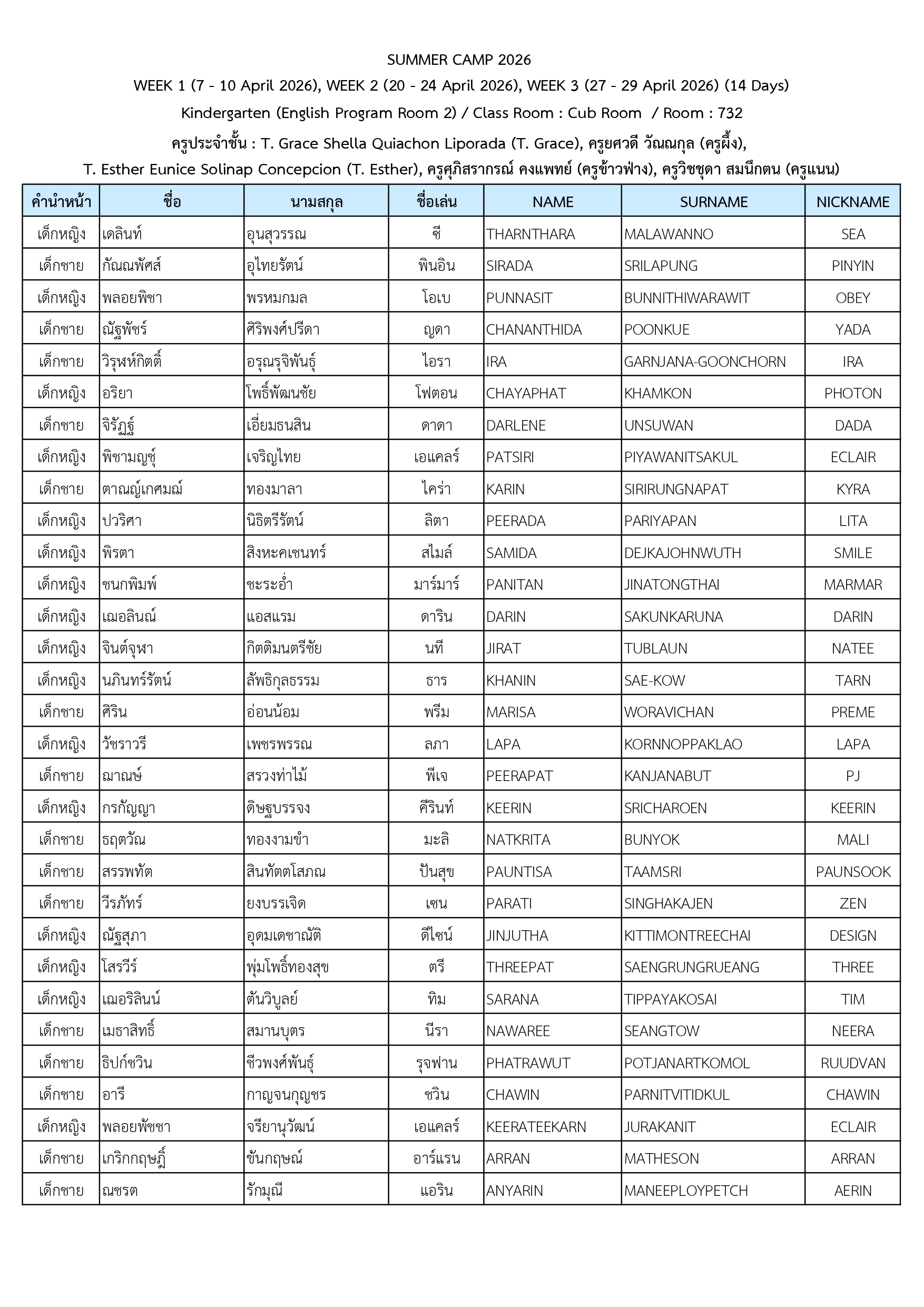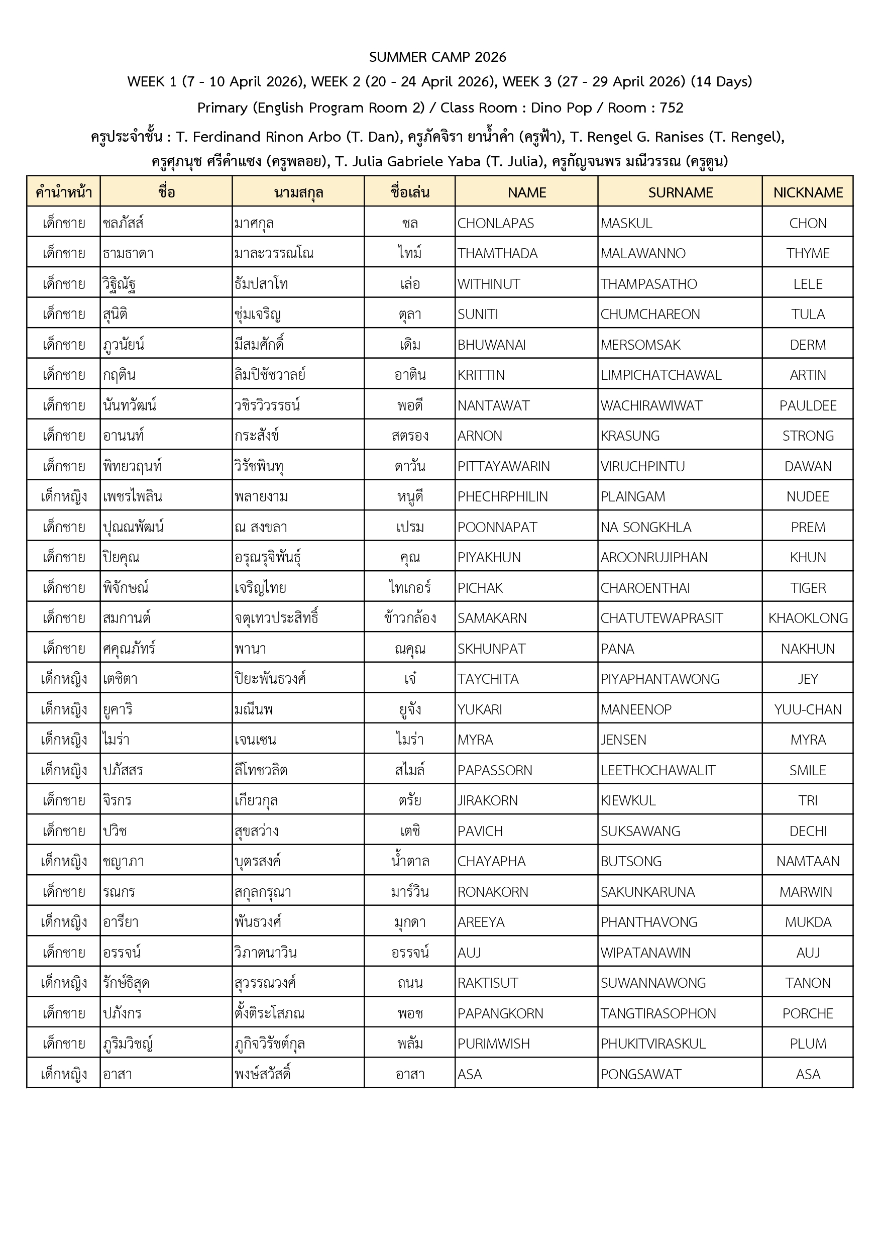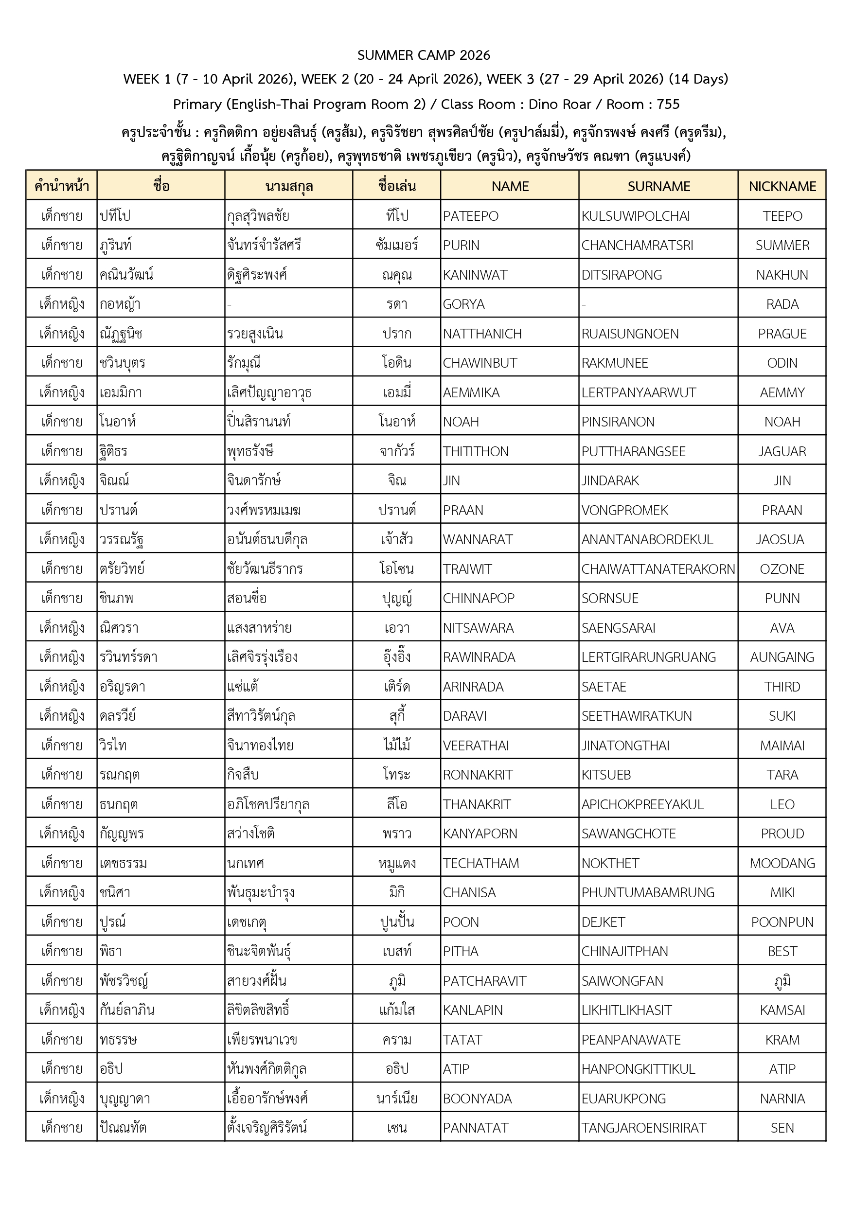 ประกาศรายชื่อนักเรียนที่เข้าร่วมโครงการ Summer Camp 2026