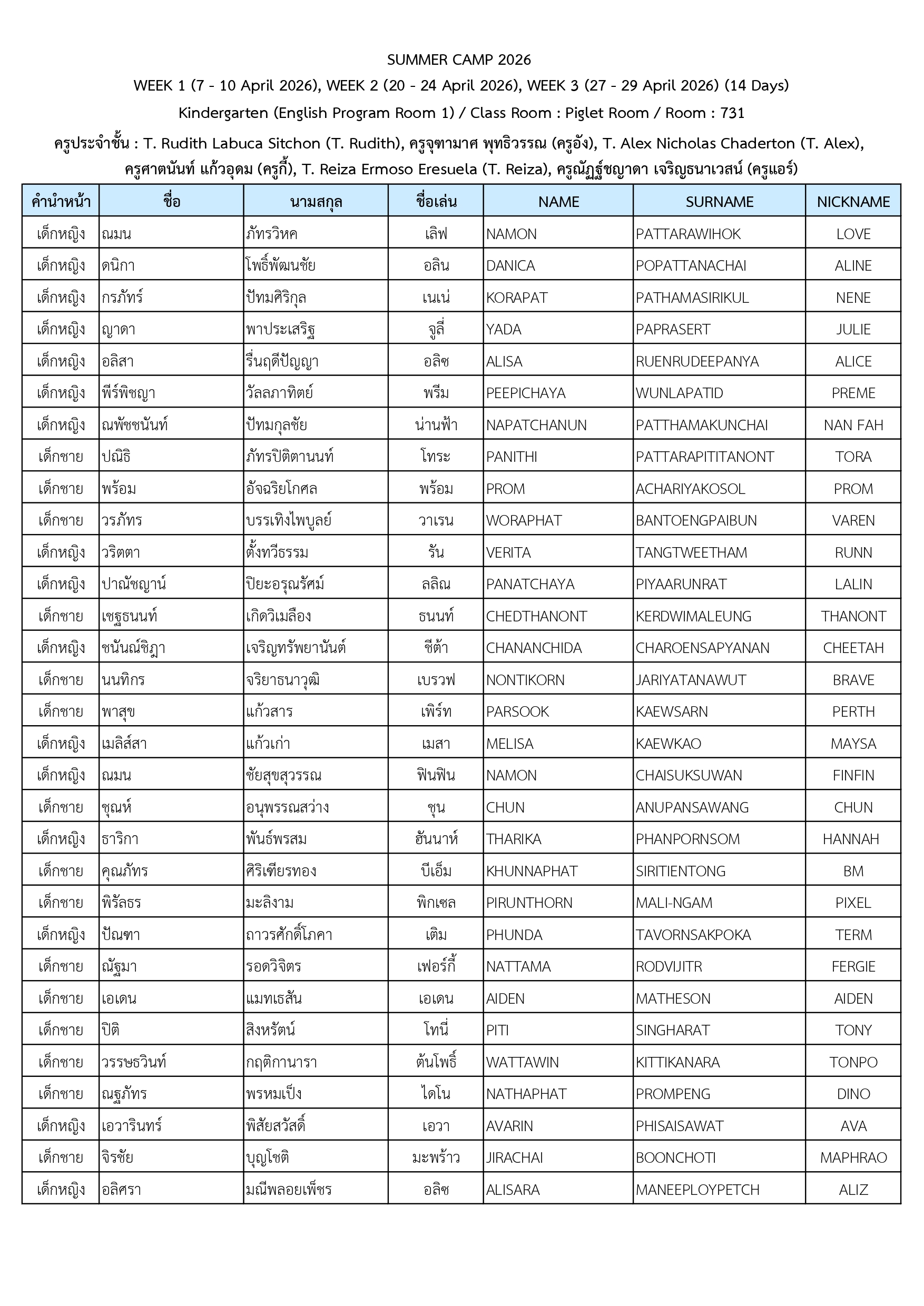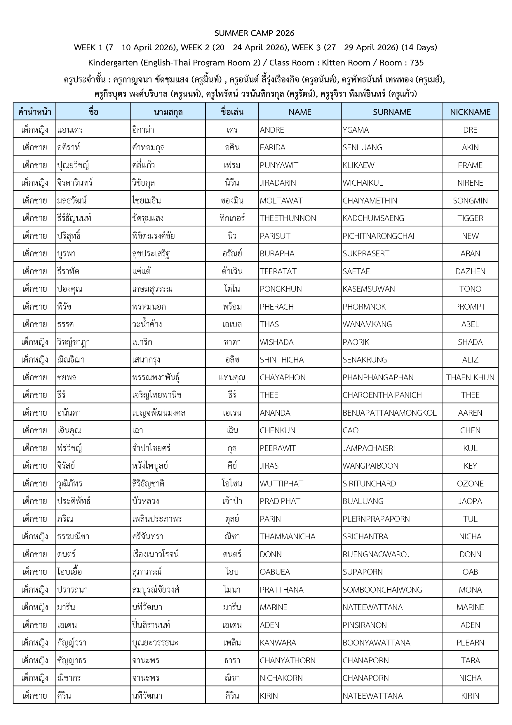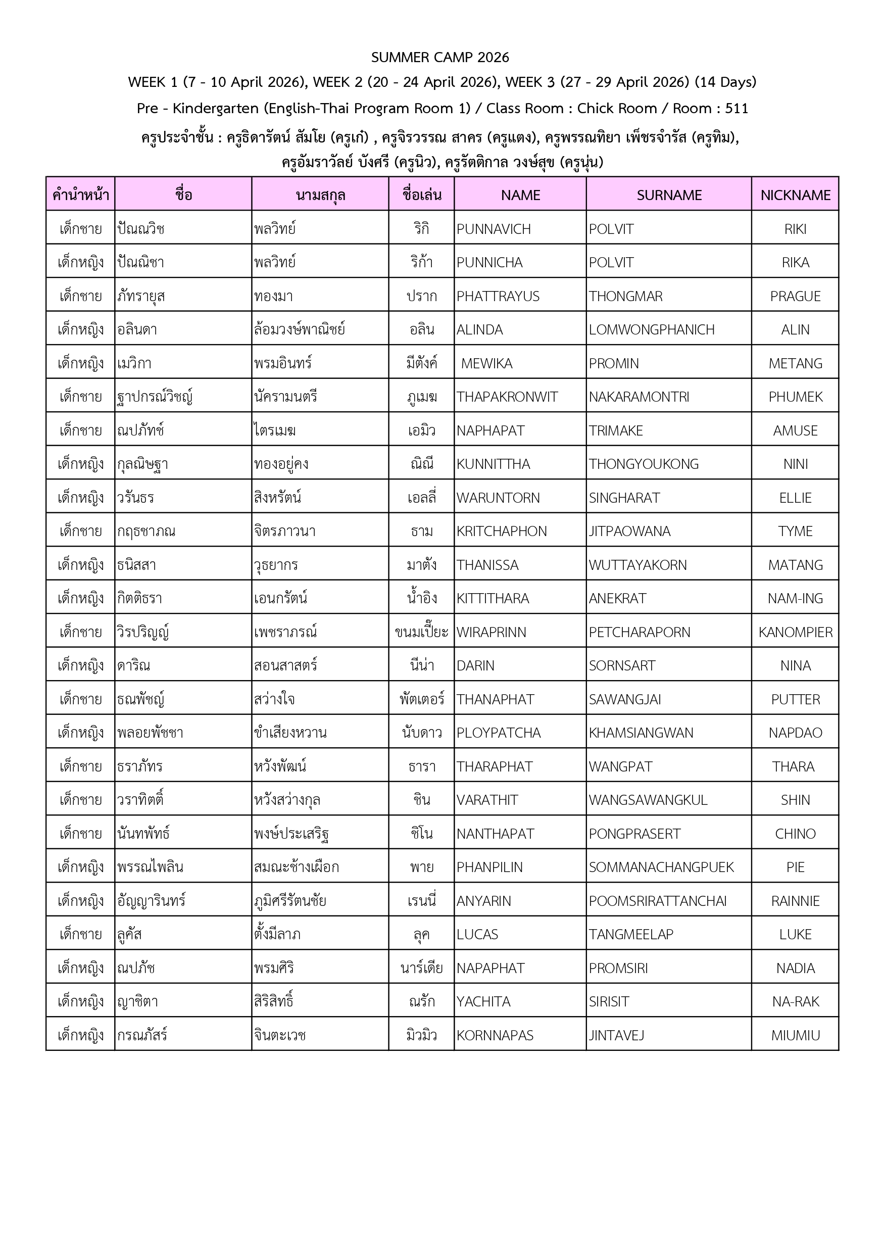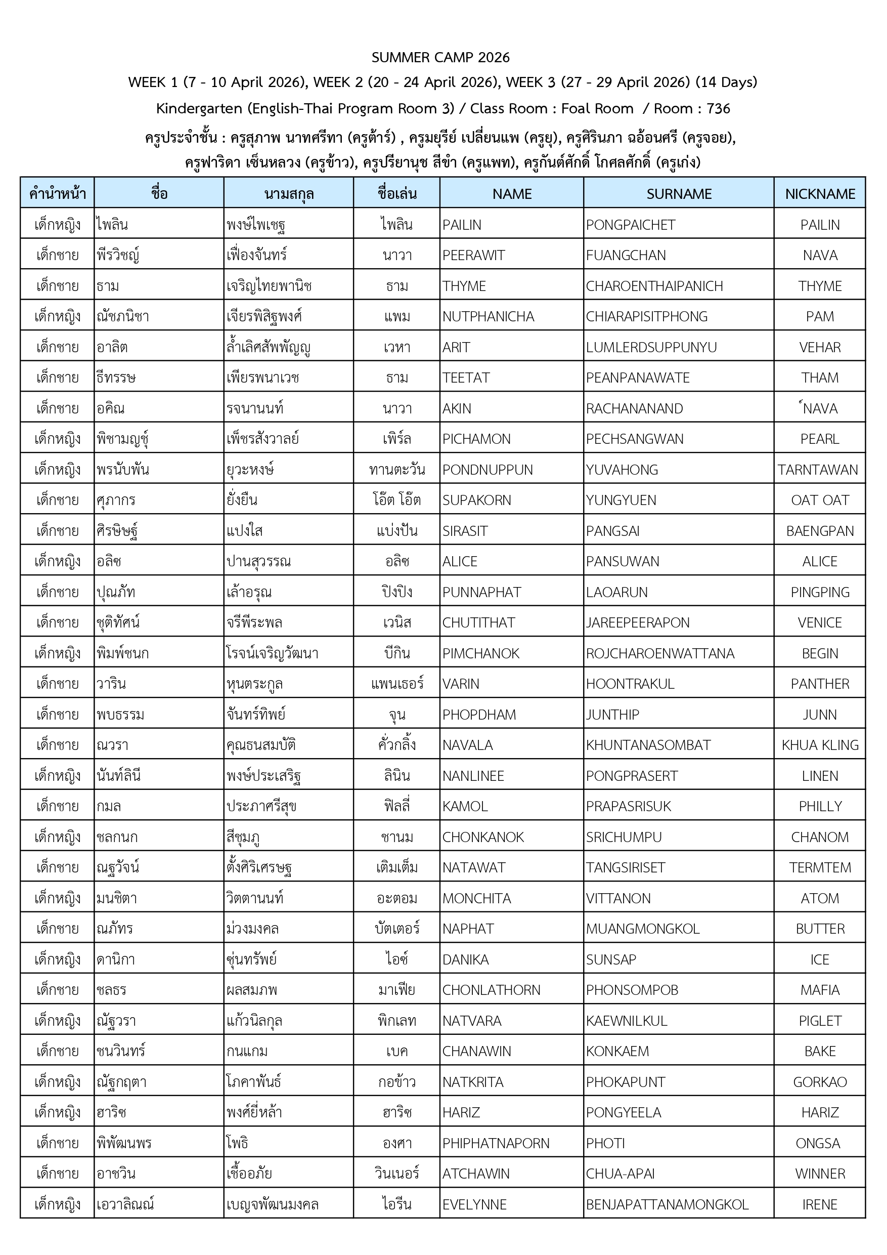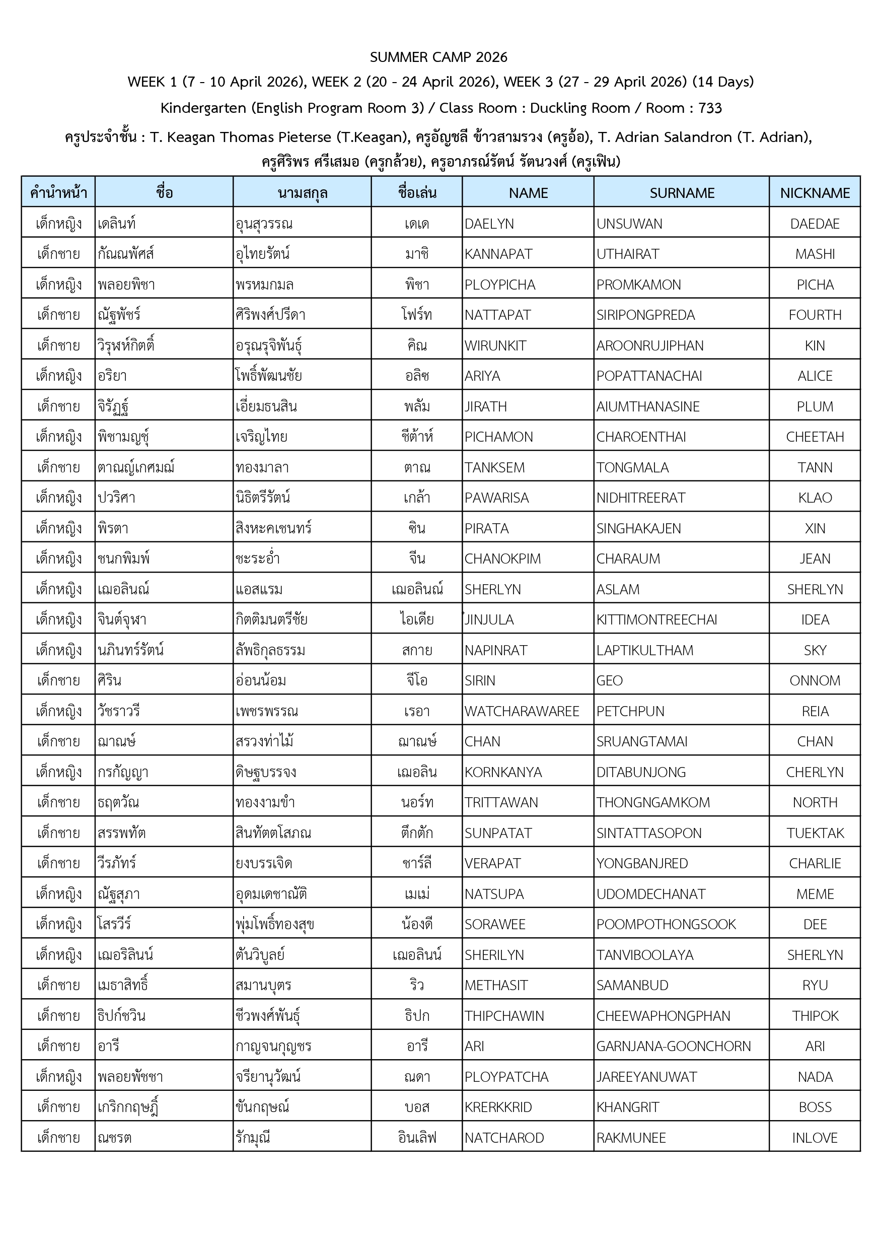 ประกาศรายชื่อนักเรียนที่เข้าร่วมโครงการ Summer Camp 2026