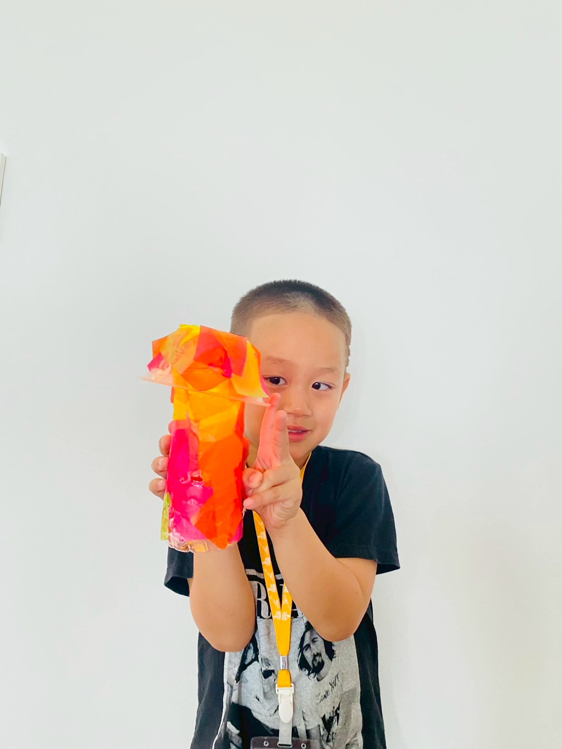 น้องๆ ได้ติดกระดาษญี่ปุ่นสีสันสดใสลงบนชามและขวดพลาสติก