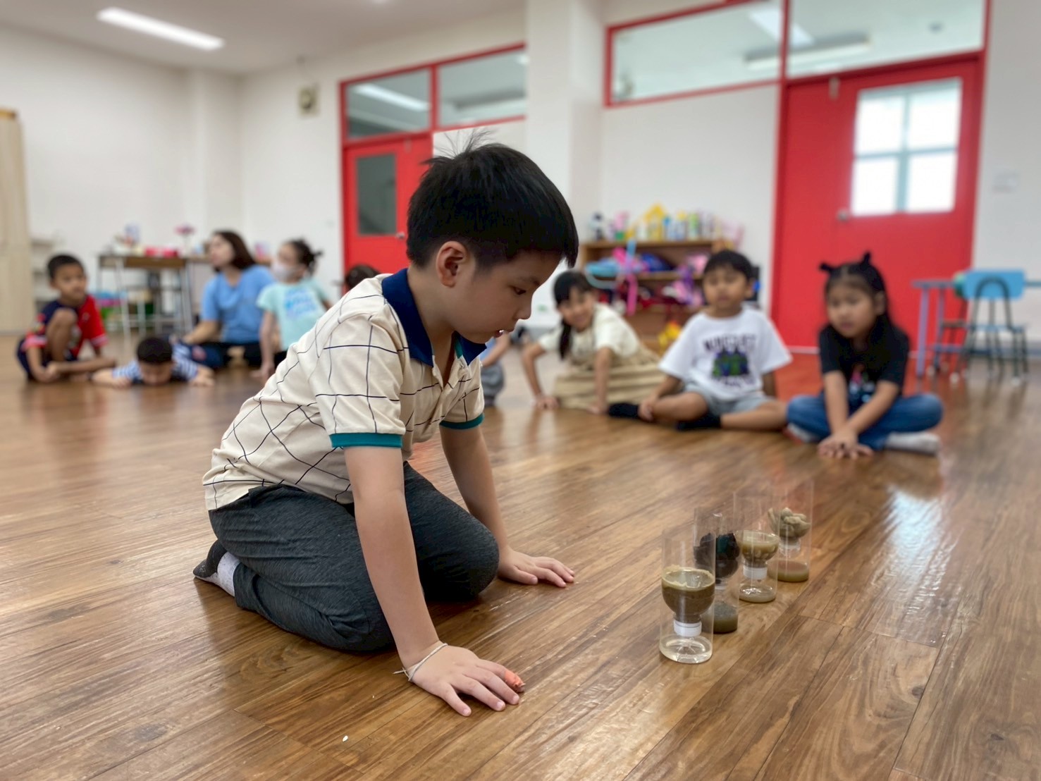 They then divided into four groups, combining all materials to create basic water filtration systems. Together, they observed the changes in water color after passing through their filters.