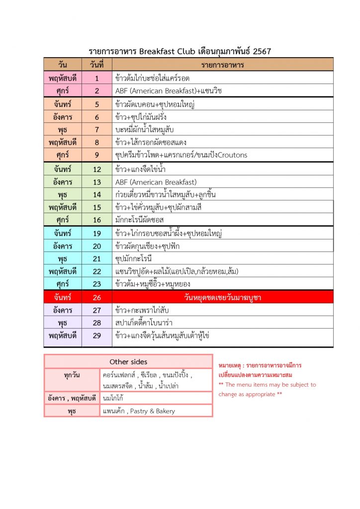 รายการอาหาร Breakfast club ประจำเดือนกุมภาพันธ์ 2567 (กรุงเทพมหานคร)