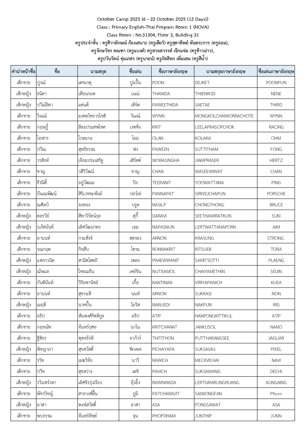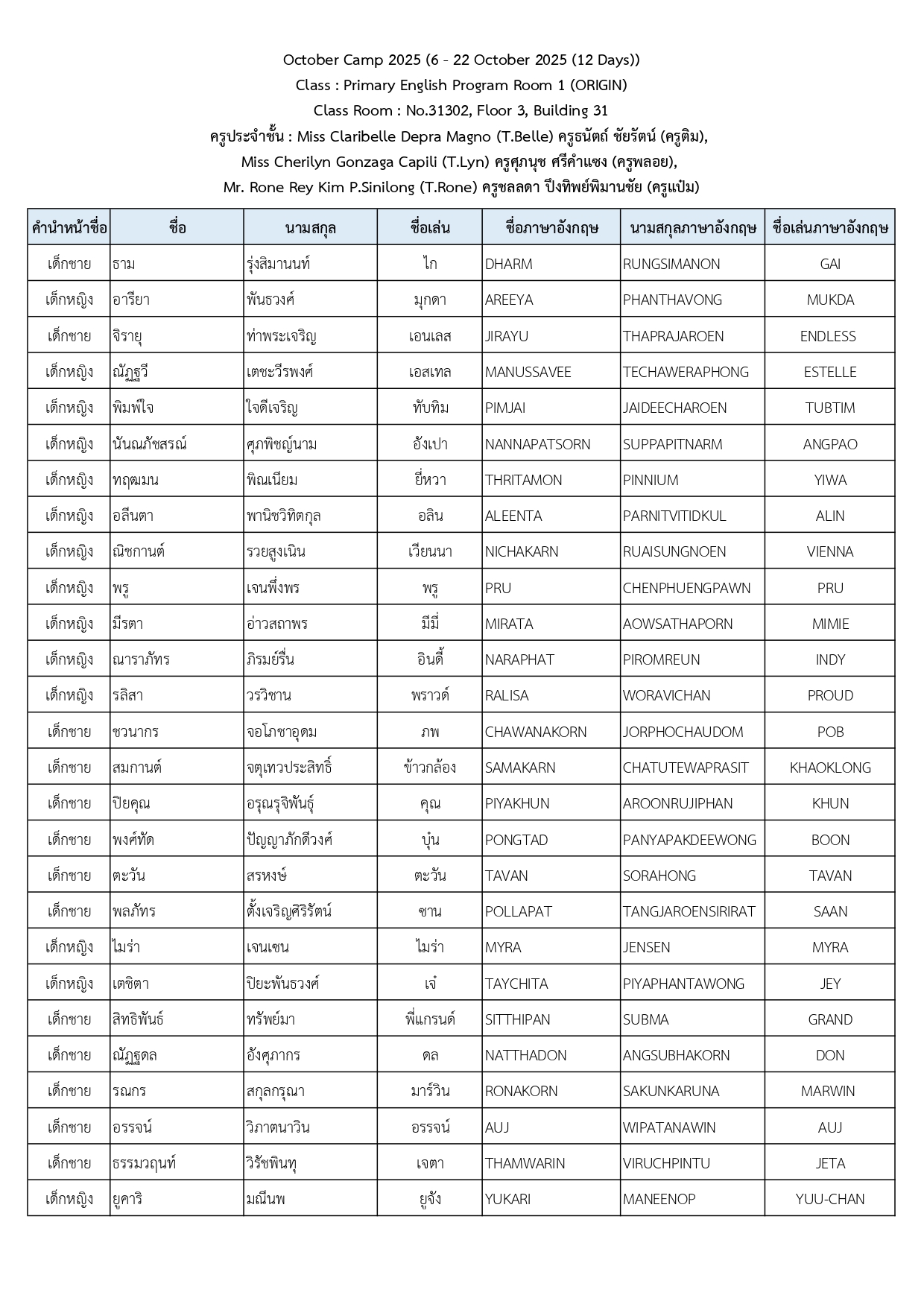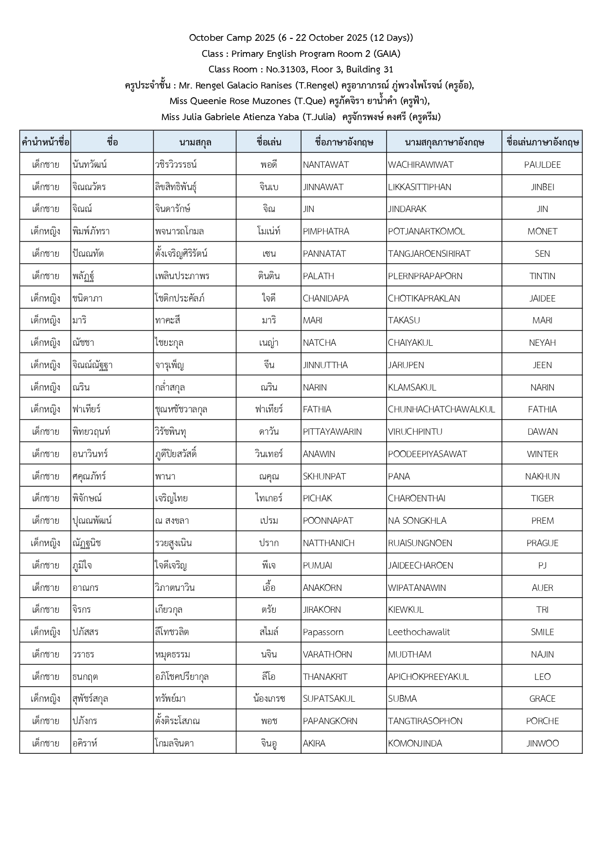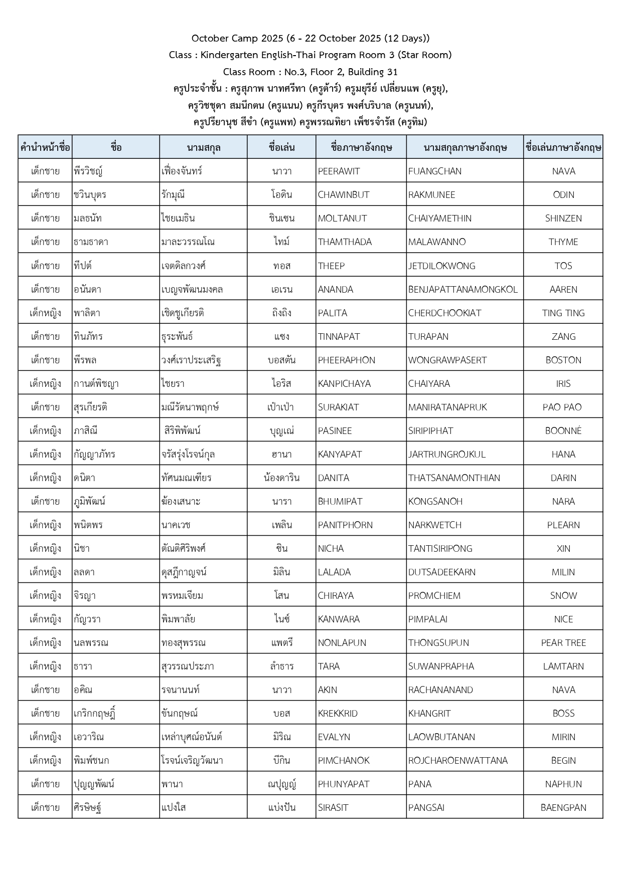 ประกาศรายชื่อนักเรียนที่เข้าร่วมโครงการ October Camp 2025 ระหว่างวันที่ 6 – 22 ตุลาคม 2568 (12 วัน)