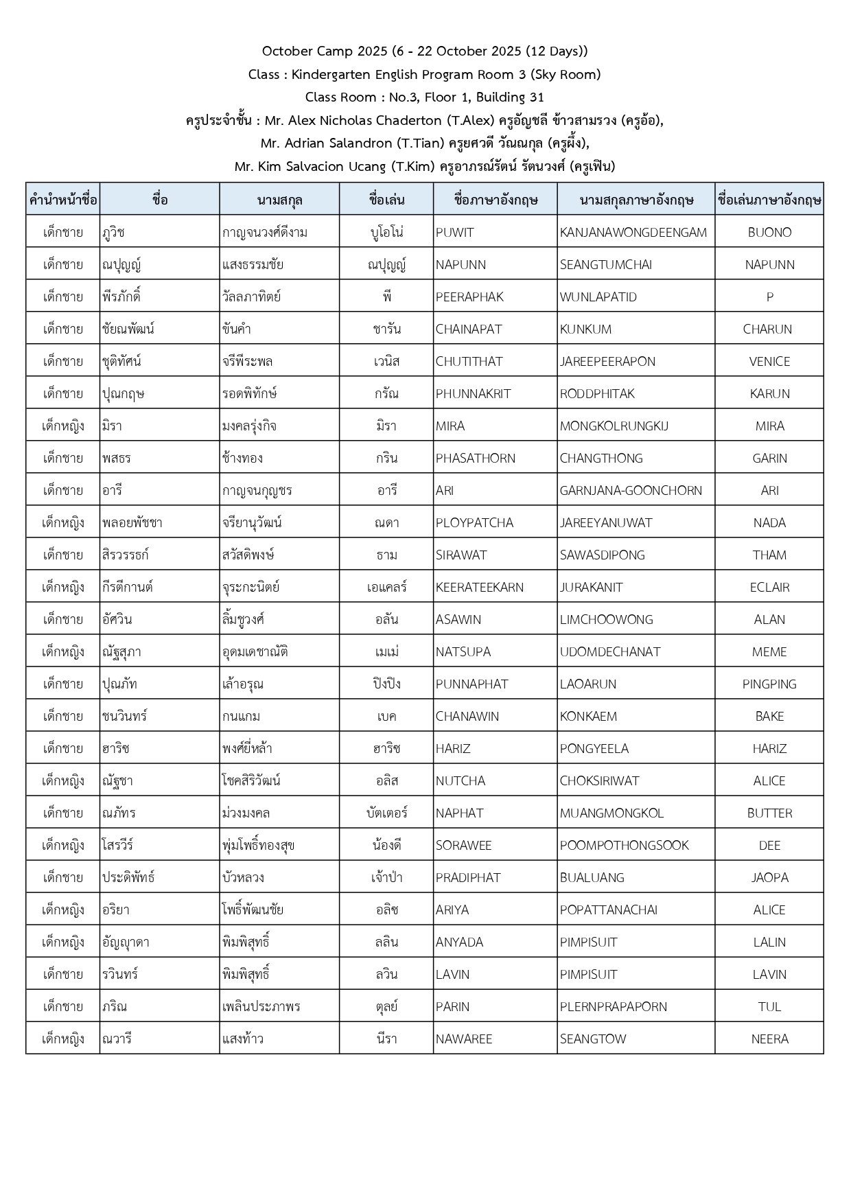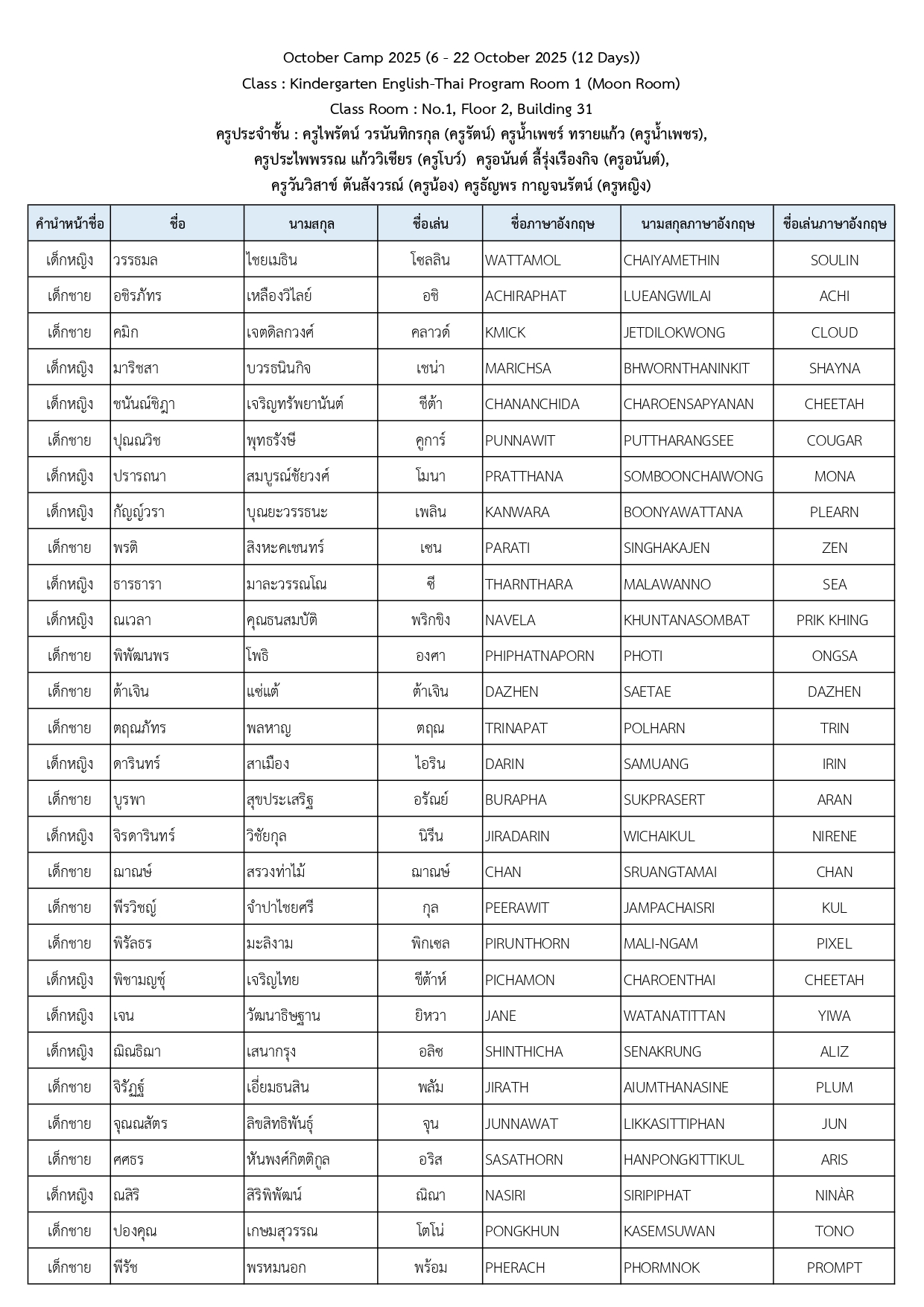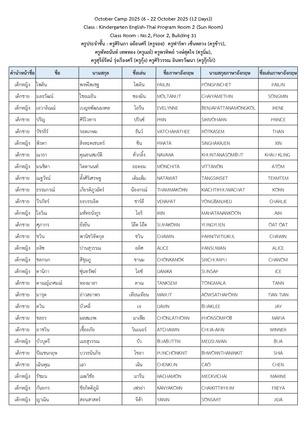 ประกาศรายชื่อนักเรียนที่เข้าร่วมโครงการ October Camp 2025 ระหว่างวันที่ 6 – 22 ตุลาคม 2568 (12 วัน)