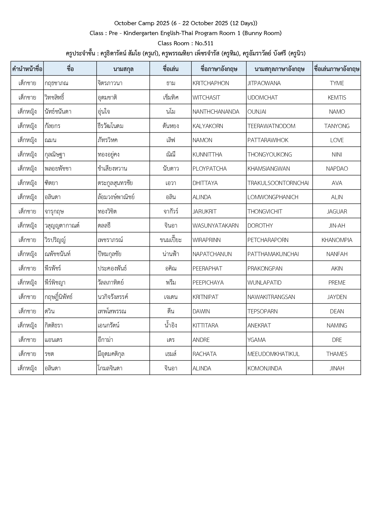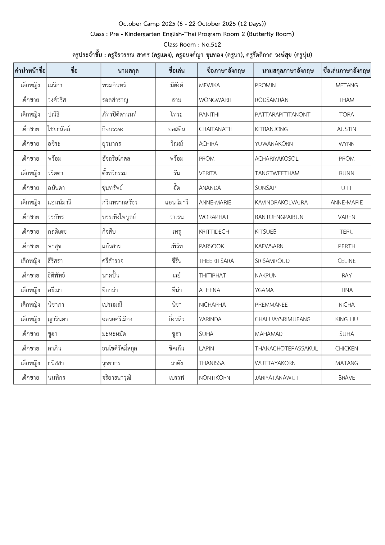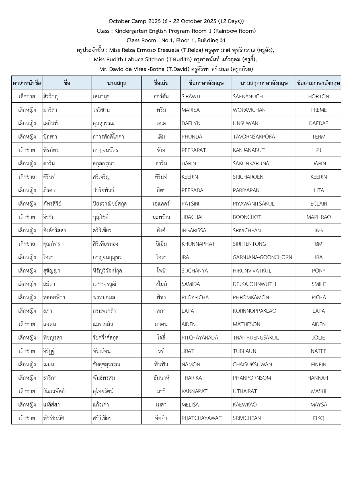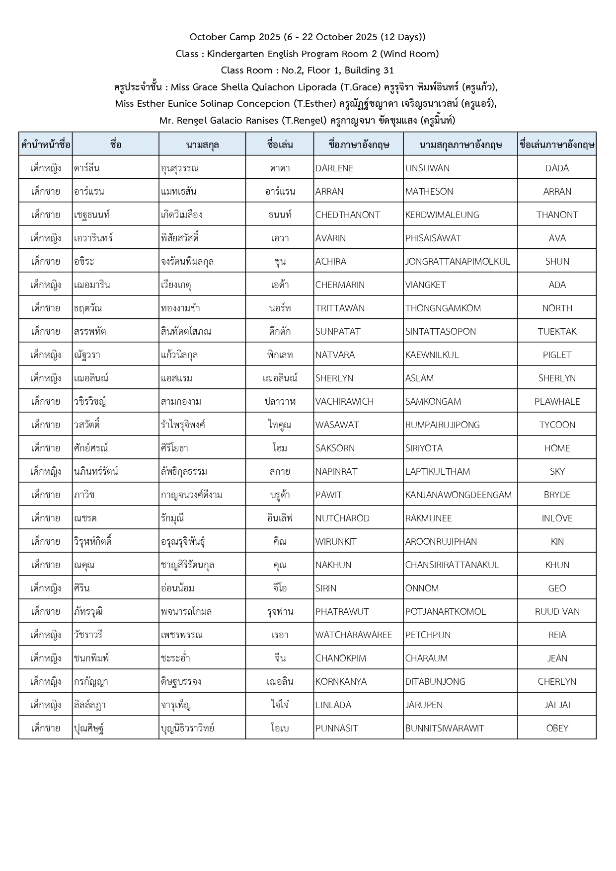 ประกาศรายชื่อนักเรียนที่เข้าร่วมโครงการ October Camp 2025 ระหว่างวันที่ 6 – 22 ตุลาคม 2568 (12 วัน)