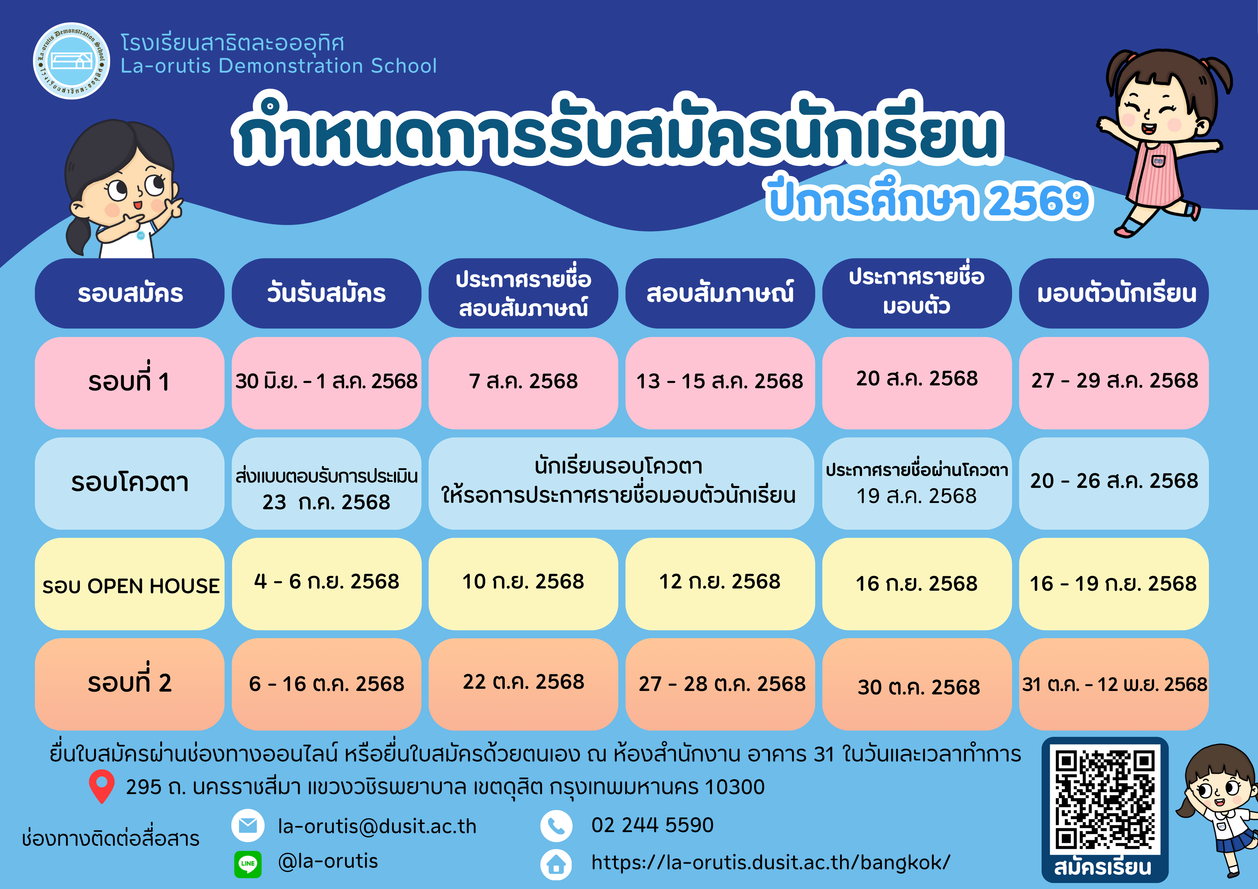 ด้วย โรงเรียนสาธิตละอออุทิศ กรุงเทพมหานคร มีความประสงค์รับสมัครนักเรียนเข้าศึกษาประจำปีการศึกษา 2569 ดังนั้น เพื่อให้การรับสมัครนักเรียนเป็นไปด้วยความเรียบร้อย โรงเรียนสาธิตละอออุทิศ กรุงเทพมหานคร จึงกำหนดการรับสมัครเข้าศึกษา รายละเอียดดังนี้