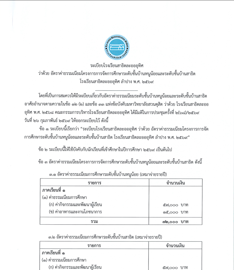 อัตราค่าธรรมเนียมโครงการการจัดการศึกษาระดับชั้นบ้านหนูน้อยและระดับชั้นบ้านสาธิต 2569 ลำปาง