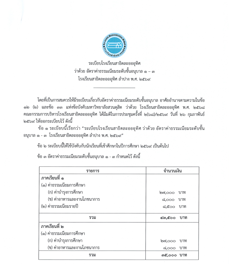 อัตราค่าธรรมเนียมโครงการการจัดการศึกษาระดับอนุบาล 1-3 2569 ลำปาง