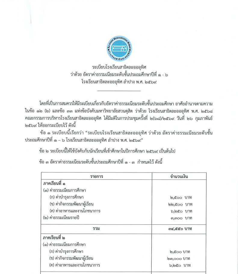 อัตราค่าธรรมเนียมระดับชั้นประถมศึกษา 1-6 2569 ลำปาง