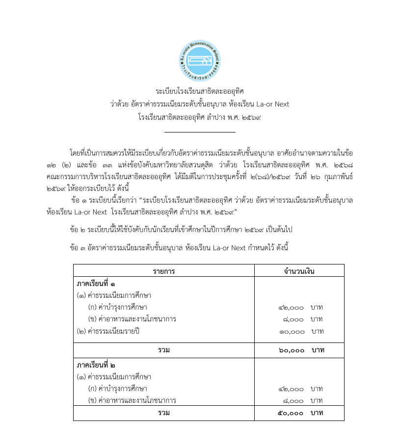 อัตราค่าธรรมเนียมระดับชั้นอนุบาล ห้องเรียน La-or Next 2569 ลำปาง