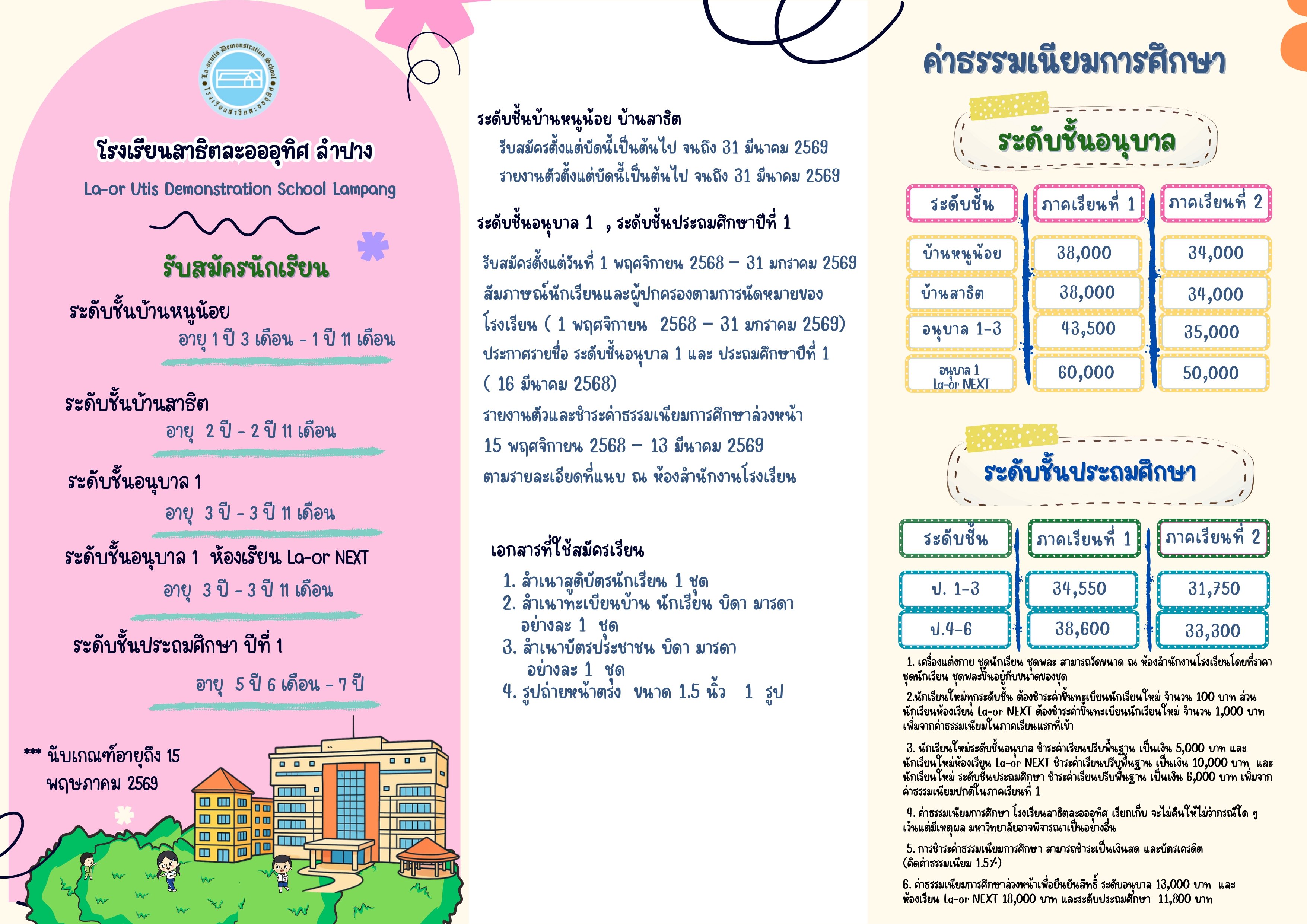 ด้วยโรงเรียนสาธิตละอออุทิศ ลำปาง มีความประสงค์รับสมัครนักเรียนเข้าศึกษาประจำปีการศึกษา 2568 ดังนั้น เพื่อให้การรับสมัครนักเรียนเป็นไปด้วยความเรียบร้อย โรงเรียนสาธิตละอออุทิศ ลำปาง จึงกำหนดการรับสมัครเข้าศึกษา รายละเอียดดังนี้