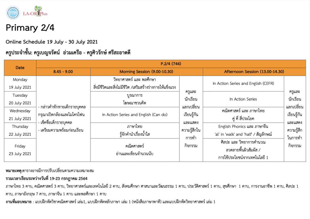 ตารางเรียน Online Learning Journey ระดับชั้นประถมศึกษาปีที่ 2 วันที่ 19-30 กรกฎาคม 2564 (กรุงเทพมหานคร) July 17, 2021July 17, 2021 Sitanan Injang ระดับชั้นประถมศึกษาปีที่ 2 P.2Download Sitanan Injang