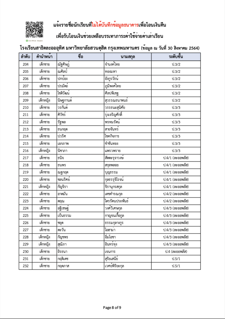 แจ้งรายชื่อนักเรียนที่ไม่ได้บันทึกข้อมูลธนาคารเพื่อโอนเงินคืน เพื่อรับโอนเงินช่วยเหลือบรรเทาภาระค่าใช้จ่ายค่าเล่าเรียน โรงเรียนสาธิตละอออุทิศ มหาวิทยาลัยสวนดุสิต กรุงเทพมหานคร (ข้อมูล ณ วันที่ 30 สิงหาคม 2564)
