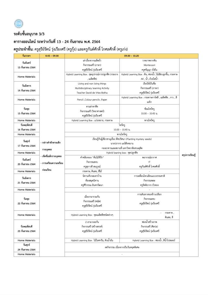 ตารางเรียน Online Learning Journey ระดับชั้นอนุบาลปีที่ 3 วันที่ 13 – 24 กันยายน 2564 (กรุงเทพมหานคร) September 9, 2021September 13, 2021 Sitanan Injang ระดับชั้นอนุบาลปีที่ 3 ตารางอนุบาลปีที่-3Download Sitanan Injang