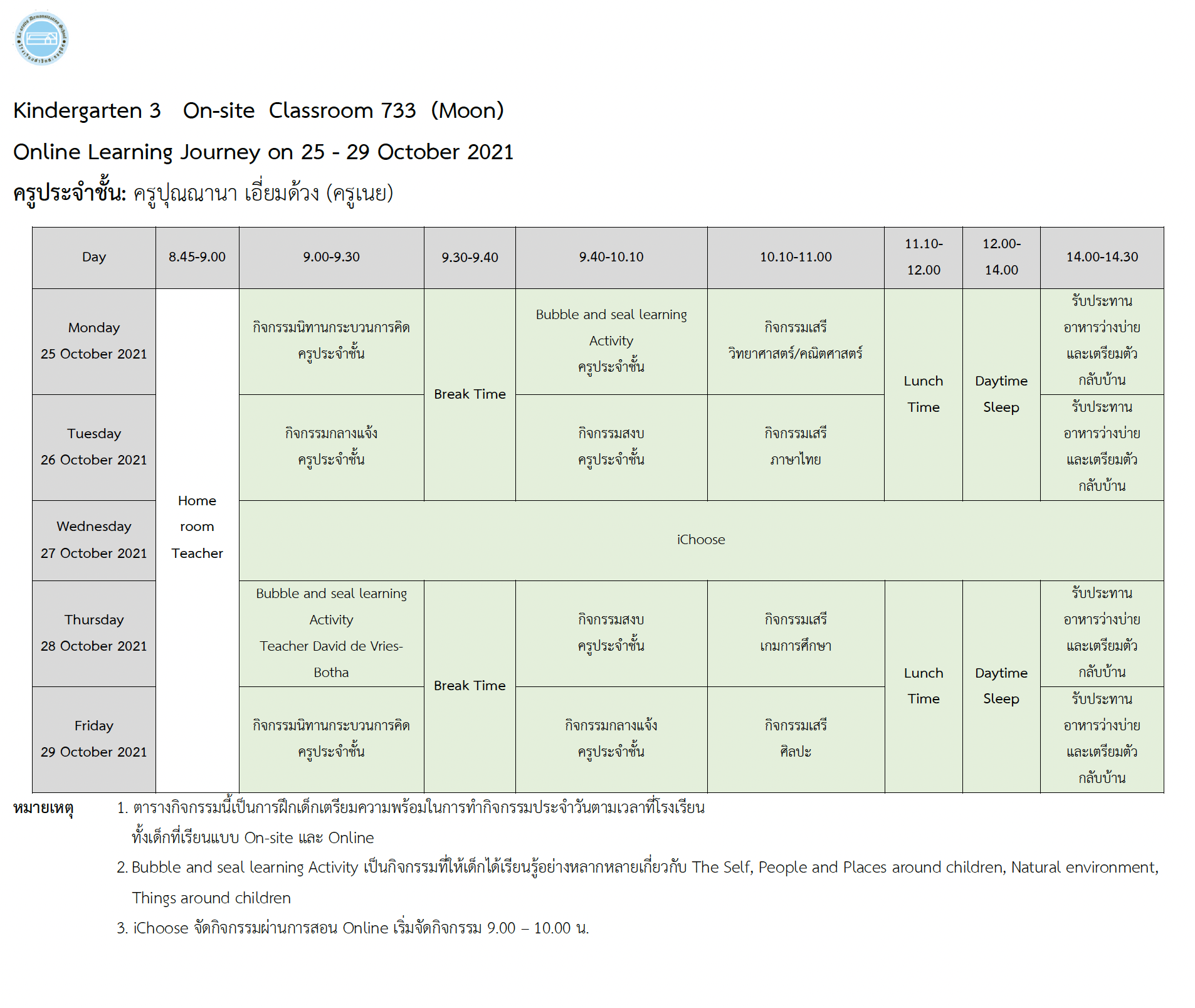 ตารางเรียน On-site และ Online ระดับชั้นอนุบาลปีที่ 3 วันที่ 25-29 ตุลาคม 2564 (กรุงเทพมหานคร) October 23, 2021October 23, 2021 la-orutis admin ระดับชั้นอนุบาลปีที่ 3 ตาราง On-site อนุบาลปีที่ 3 (Download PDF) la-orutis admin