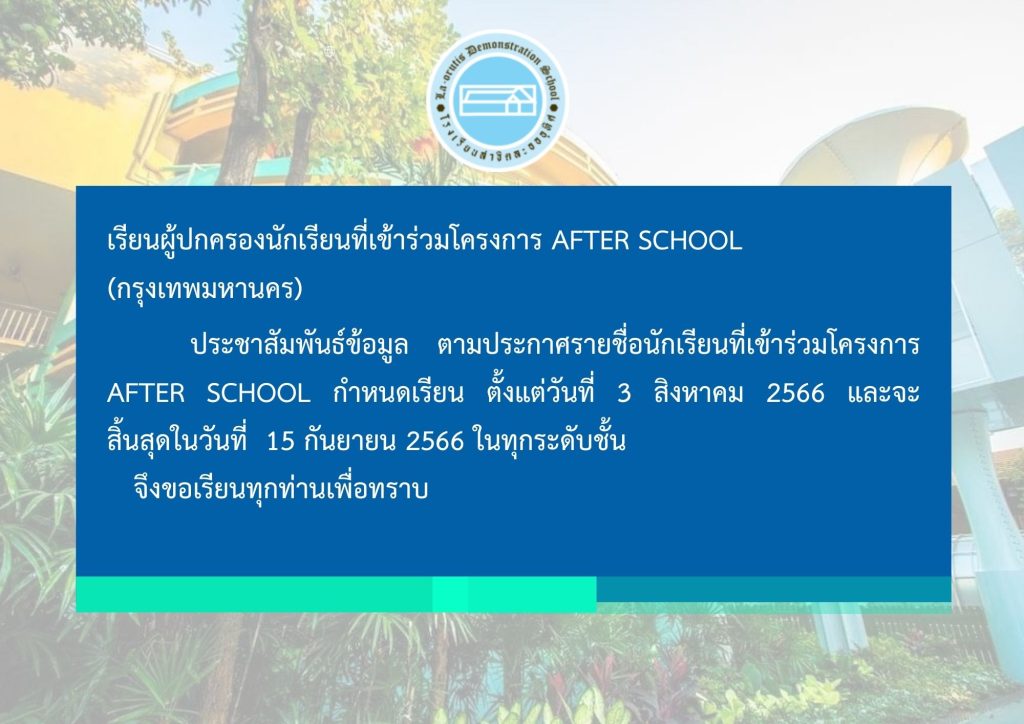 ประชาสัมพันธ์ข้อมูลโครงการ AFTER SCHOOL กำหนดเรียน ตั้งแต่ 3 สิงหาคม – 15 กันยายน 2566 ในทุกระดับชั้น และกำหนดการรับส่งนักเรียนตามเวลาปกติ วันที่ 18 กันยายน 2566 September 1, 2023September 1, 2023 la-orutis admin ประกาศ la-orutis admin