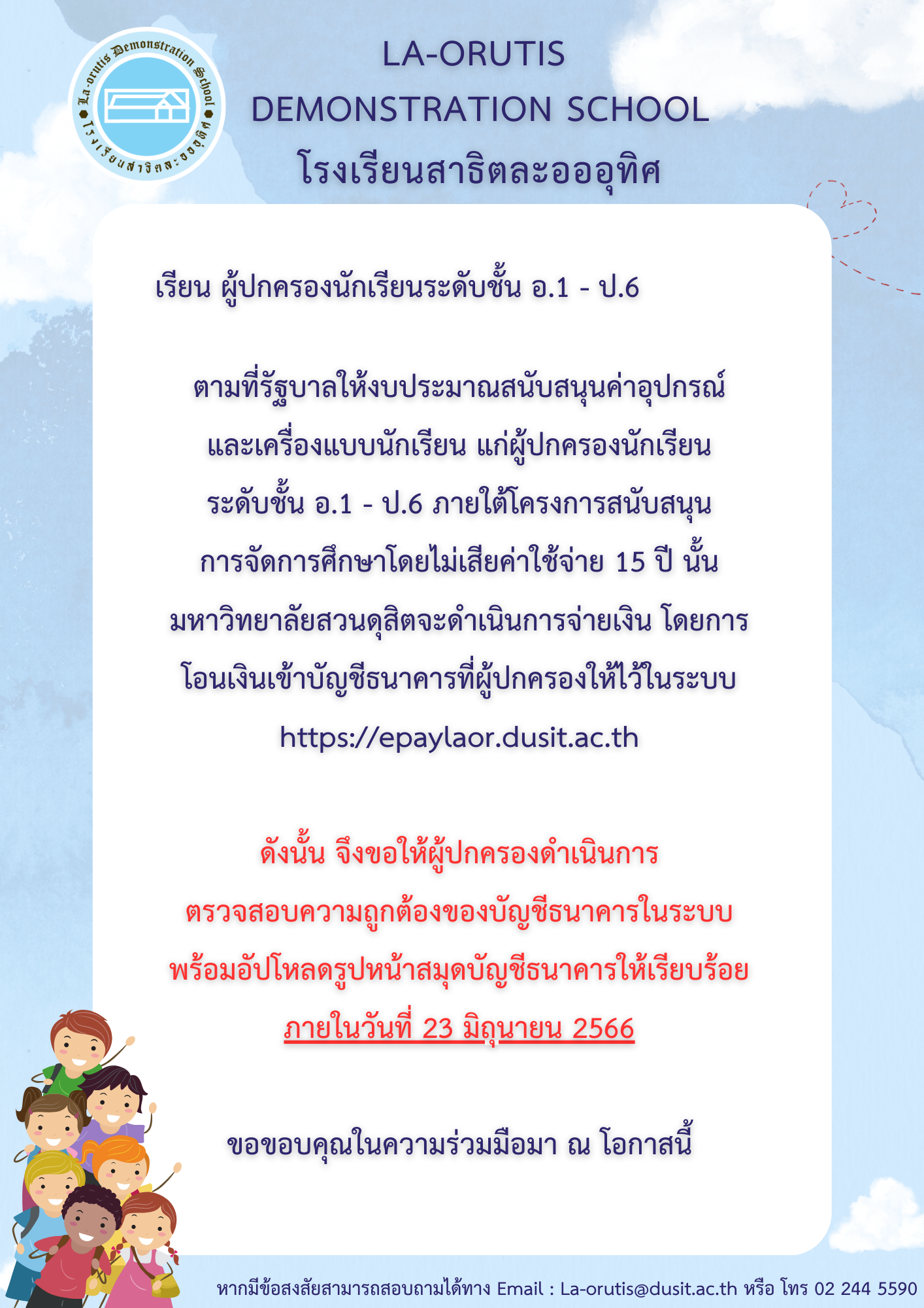 ประชาสัมพันธ์ผู้ปกครองนักเรียนระดับชั้น อ.1 – ป.6 การตรวจสอบความถูกต้องของบัญชีธนาคาร June 22, 2023June 22, 2023 la-orutis admin ข่าวประชาสัมพันธ์, ประกาศสำคัญ, ผู้ปกครอง เรียน ผู้ปกครองนักเรียนระดับชั้น อ.1 – ป.6ขอให้ผู้ปกครองดำเนินการตรวจสอบความถูกต้องของบัญชีธนาคารในระบบพร้อมอัปโหลดรูปหน้าสมุดบัญชีธนาคารให้เรียบร้อยภายในวันที่ 23 มิถุนายน 2566ระบบ https://epaylaor.dusit.ac.th la-orutis admin