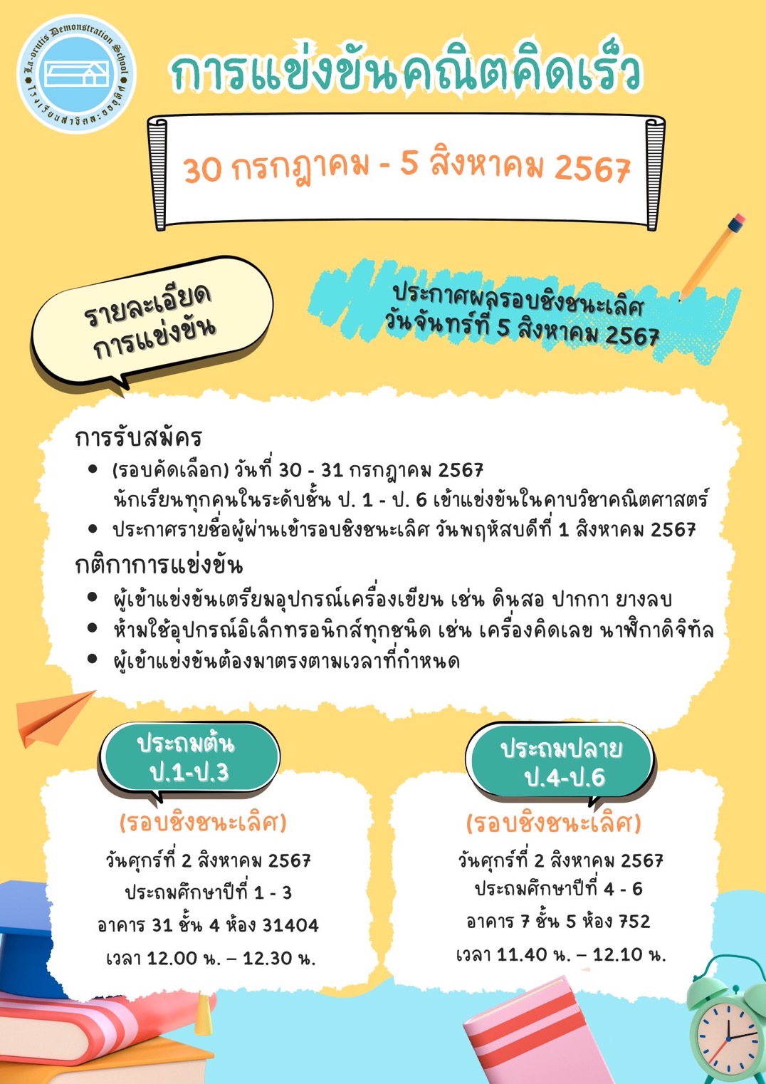 ประชาสัมพันธ์โครงการ การแข่งขันคณิตคิดเร็ว วันที่ 30 กรกฎาคม – 5 สิงหาคม 2567 July 18, 2024 la-orutis admin ข่าวประชาสัมพันธ์, ประกาศ, ผู้ปกครอง รายละเอียดการแข่งขัน la-orutis admin