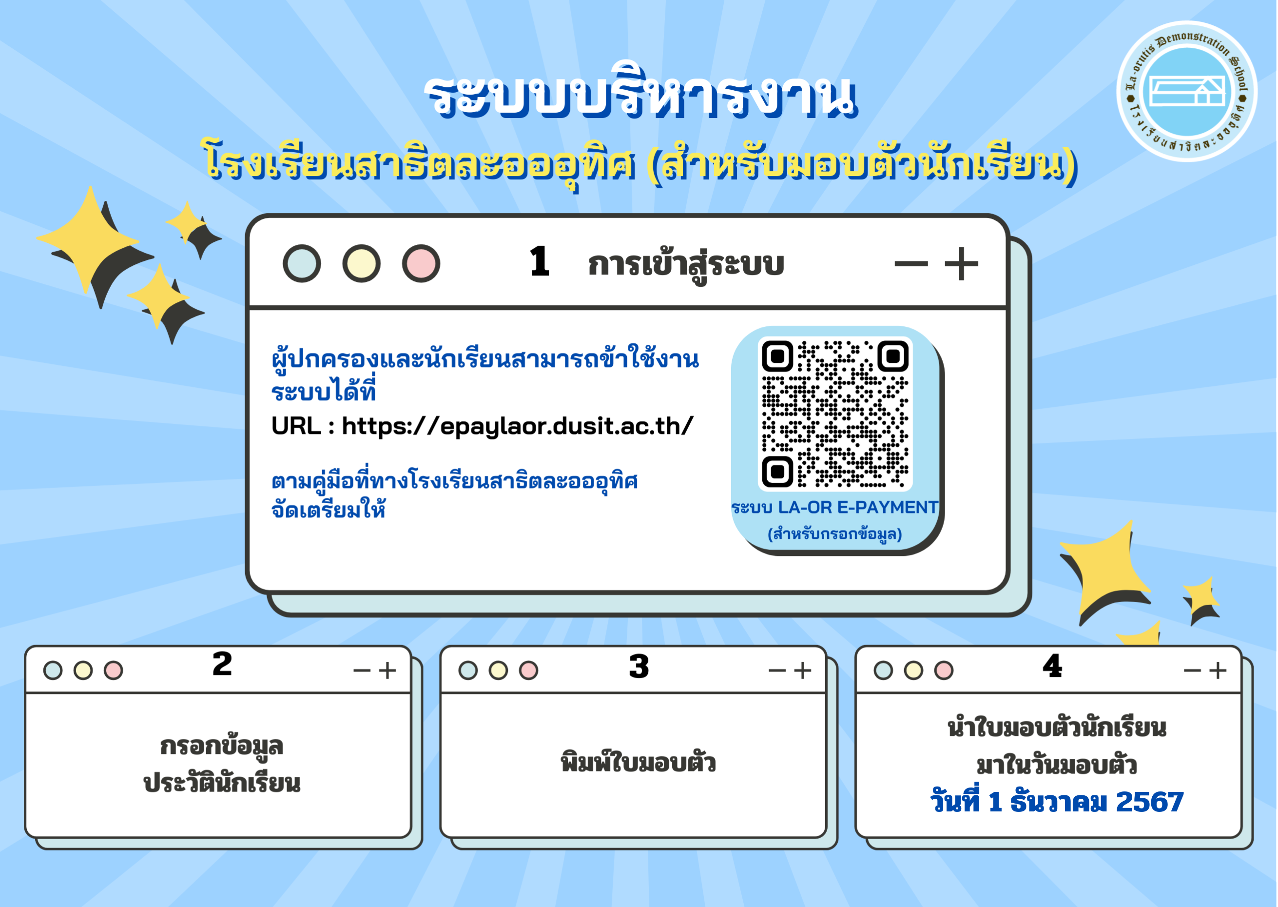 ประกาศรายชื่อนักเรียนที่มีสิทธิ์มอบตัวนักเรียนเข้าศึกษาต่อ ในระดับบ้านหนูน้อย บ้านสาธิต อนุบาลปีที่ 1 และประถมศึกษาปีที่ 1 รอบ 1 ประจำปีการศึกษา 2568 November 19, 2024November 20, 2024 la-orutis admin ประกาศ ขั้นตอนการกรอกข้อมูลในระบบบริหารงานโรงเรียน La-or e-payment เพื่อพิมพ์ใบมอบตัวนักเรียน คู่มือ-la-or-epayment-การกรอกข้อมูลมอบตัวDownload la-orutis admin