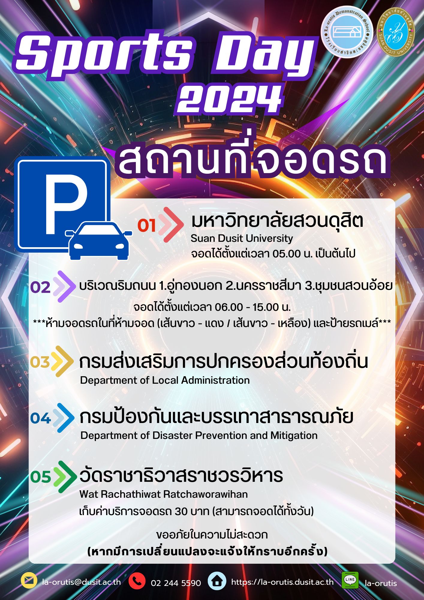 - ทางโรงเรียนจะประชาสัมพันธ์ข้อมูลเกี่ยวกับสถานที่จอดรถภายในบริเวณโรงเรียนและบริเวณโดยรอบผ่านเว็บไซต์: