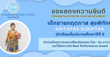 เด็กชายกฤตภาส สุขพิทักษ์ นักเรียนชั้นประถมศึกษาปีที่ 5 เข้าร่วมโครงการเเลกเปลี่ยนวัฒธรรม ไทย – จีน นานาชาติ เเละได้รับรางวัล Best Performance Award
