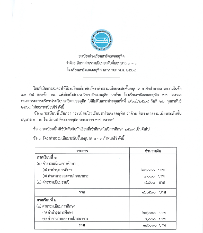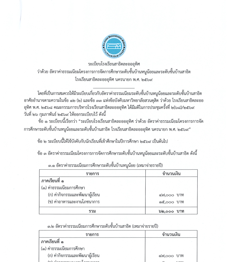 อัตราค่าธรรมเนียมโครงการการจัดการศึกษาระดับชั้นบ้านหนูน้อยและระดับชั้นบ้านสาธิต 2569 นครนายก