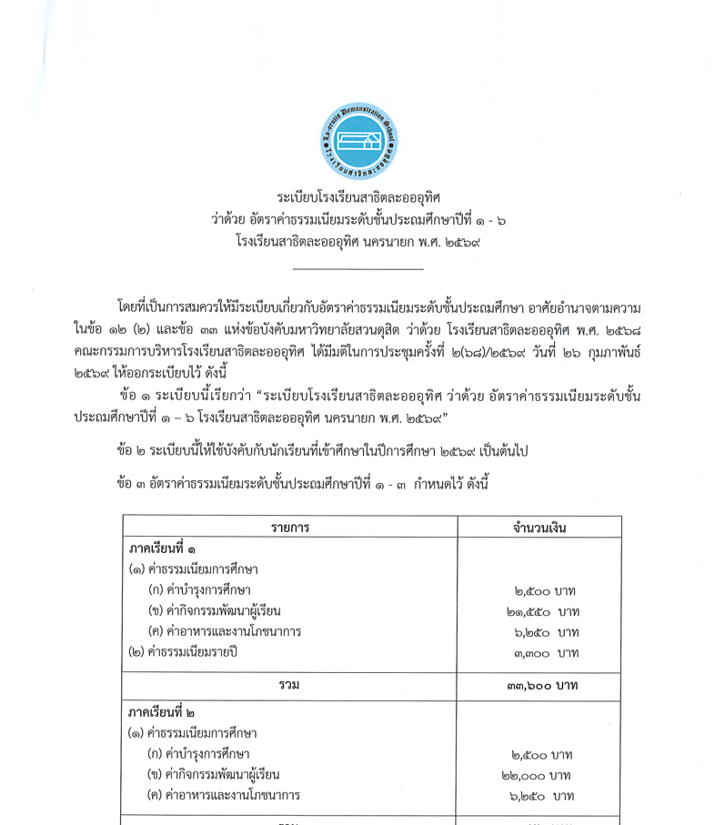 อัตราค่าธรรมเนียมระดับชั้นประถมศึกษา 1-6 2569 นครนายก